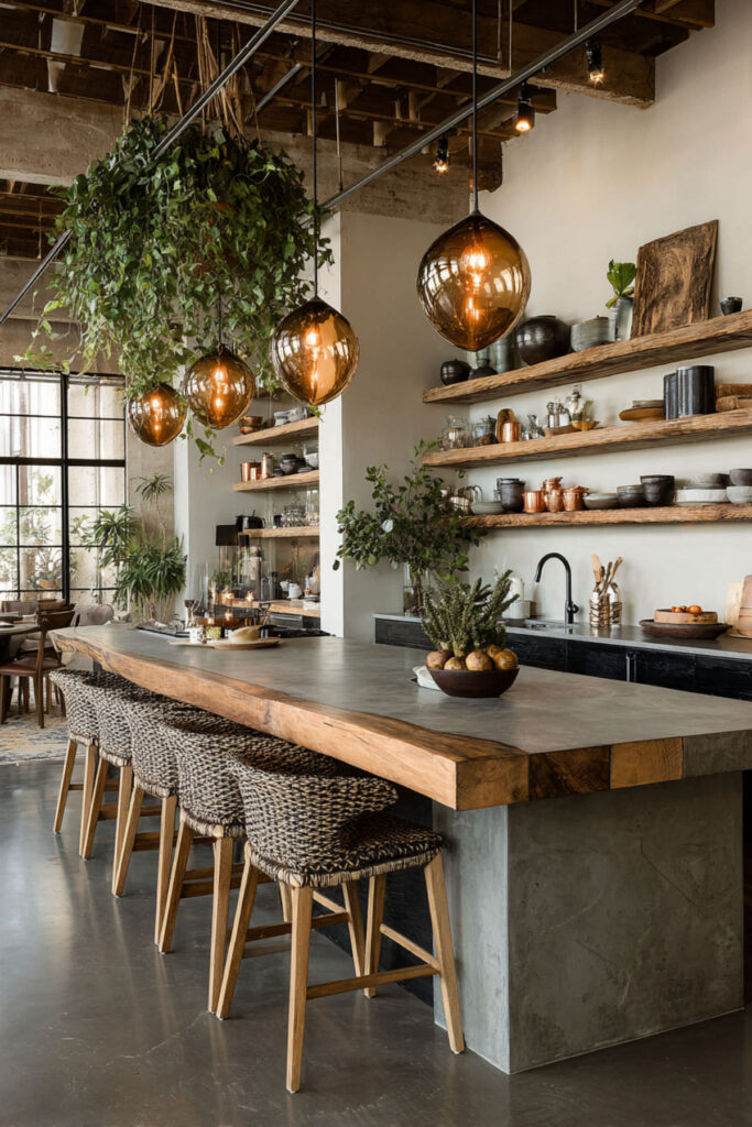 Multi-level islands work brilliantly in lofts—a higher bar level for casual dining, lower prep level for cooking. This creates zones within open spaces and adds visual interest. Use different materials for each level: concrete for bar top, wood for prep surface.