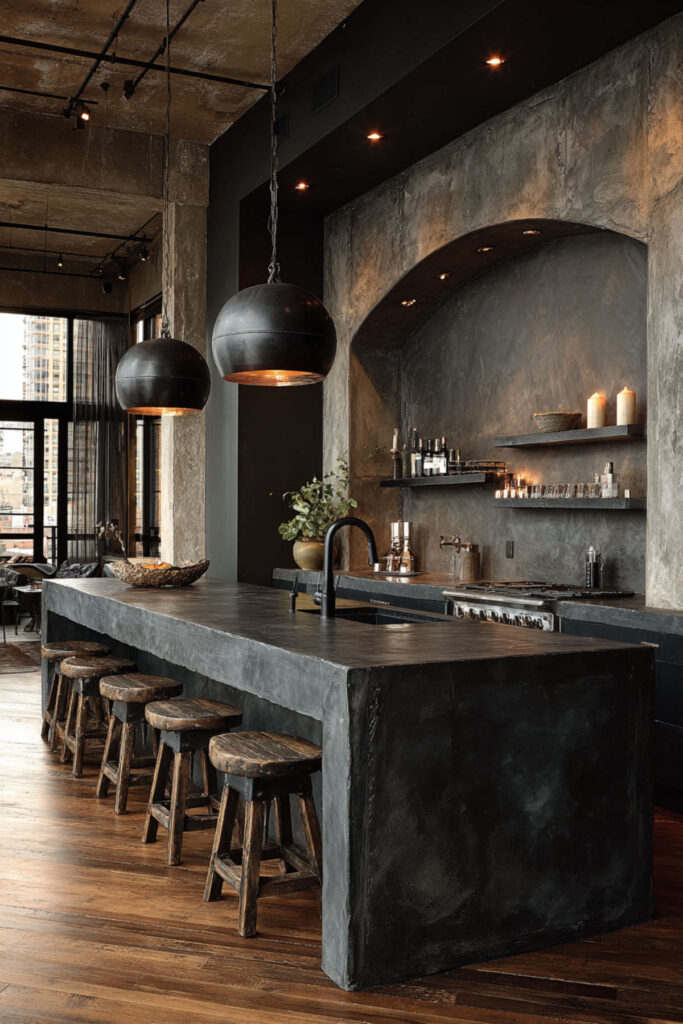 Concrete backsplashes bring that raw industrial element while being surprisingly practical—no grout lines, completely customizable, and naturally heat-resistant. You can go smooth and polished or rough and textured depending on your comfort level with industrial aesthetics.