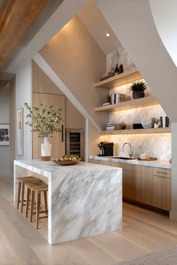 Loft kitchens often deal with weird angles from sloped ceilings or unusual architecture. Embrace these quirks rather than fighting them. Custom shelving that follows the slope, lighting that highlights interesting angles, or a backsplash that extends into unusual spaces.