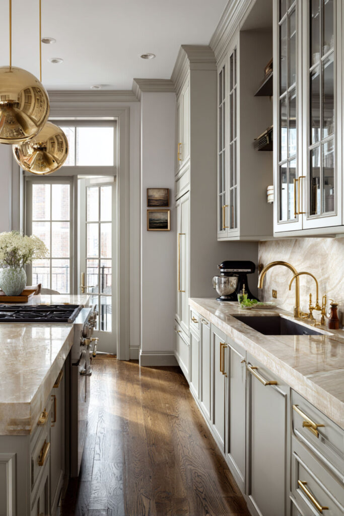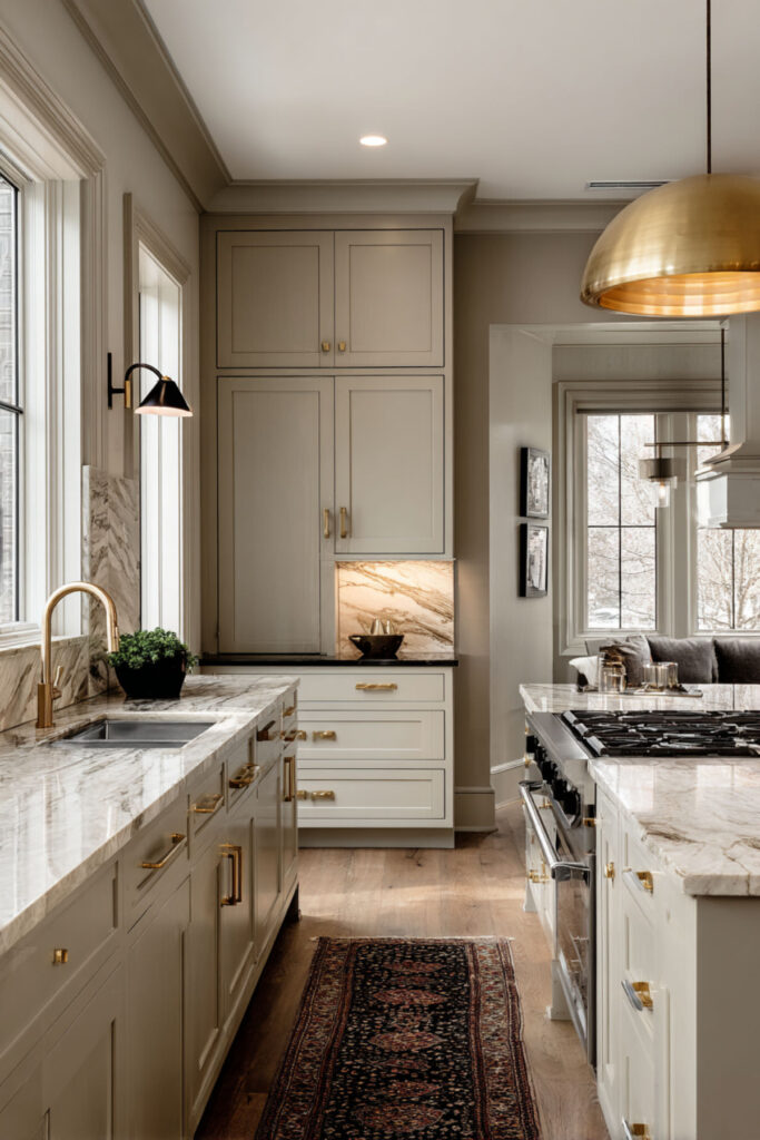A gold kitchen with gold accents rather than overwhelming gold everything provides warm minimalism that prevents sterility. Kitchen with gold accents might include brass hardware, gold faucets, or champagne-toned lighting fixtures. These metallic touches add luxury without cluttering, warmth without weight. The gold elements should be consistent in tone – all brass or all rose gold – to maintain cohesion.