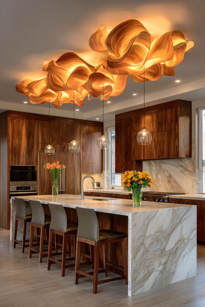 Artistic lighting in luxury kitchens serves as both illumination and the room’s jewelry – one exceptional fixture rather than multiple competing elements. Choose oversized pendant lights or glam pendant lights that make a statement while maintaining clean lines elsewhere. Gold pendant island lights or glass pendant lights with gold trim add warmth to cool surfaces without cluttering.