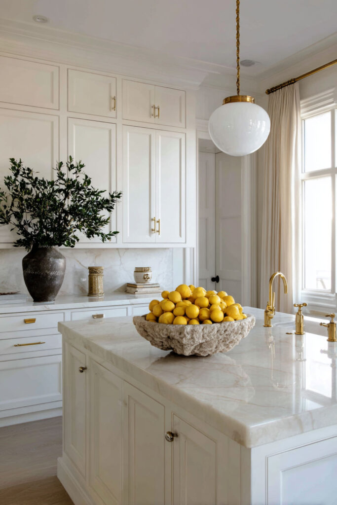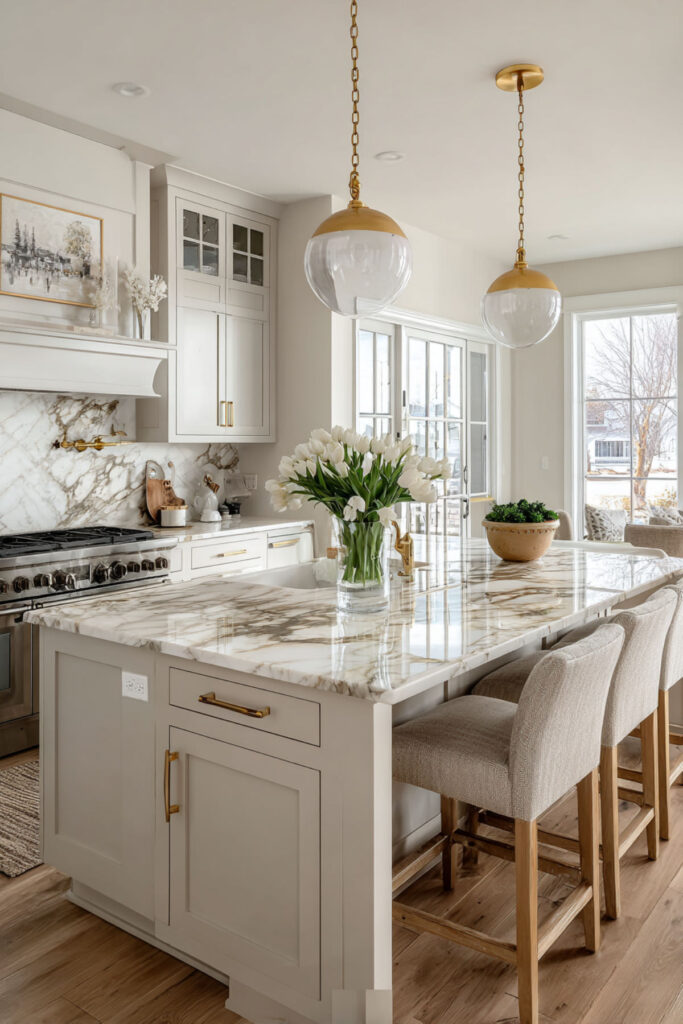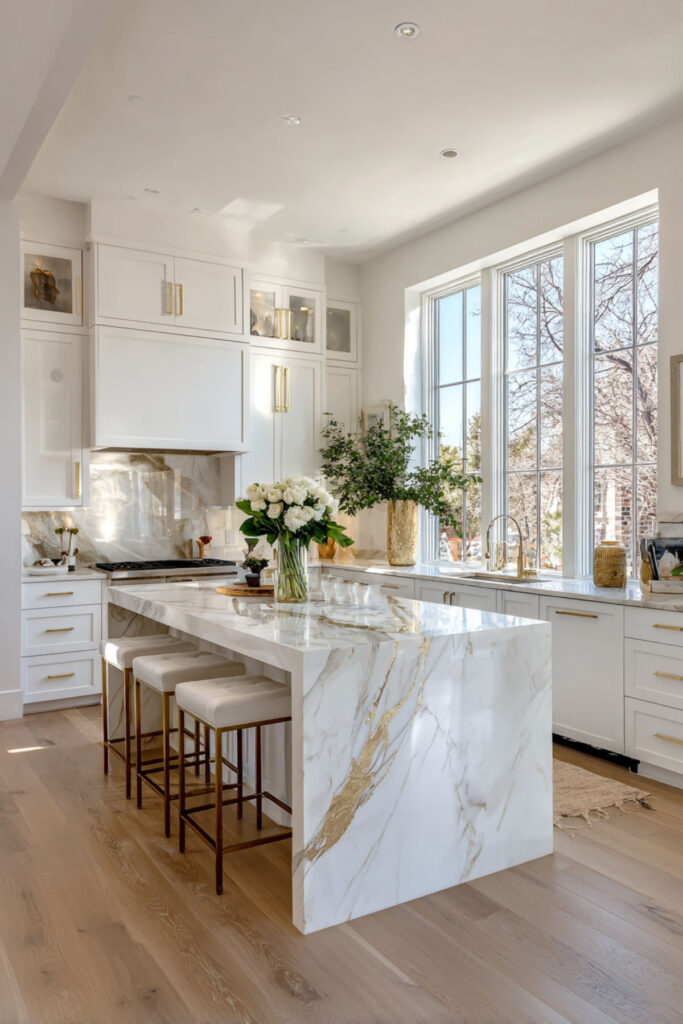 In luxury marble kitchen design for calm-seeking women, the marble becomes the single decorative element needed. Choose exceptional marble – perhaps Calacatta Gold or Statuario – with veining that provides all necessary visual interest. The marble countertops should be book-matched if possible, creating art from natural stone that never overwhelms or dates. This single material statement eliminates the need for decorative backsplashes or complex color schemes.