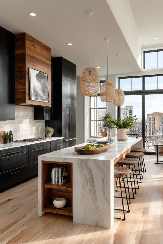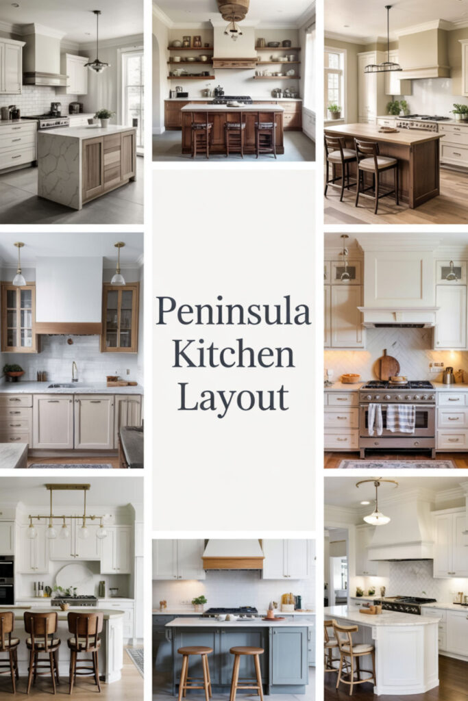 A kitchen with peninsula layout creates sophisticated separation without the commitment of a full island. The peninsula can be different height than counters – bar height for dining, counter height with waterfall edge for prep. Use the peninsula to hide less attractive necessities: trash pullout, dishwasher, recycling.