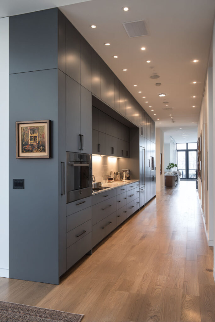 This approach works particularly well in condos where horizontal space is limited but ceiling height generous, particularly when complemented by a slim tall pantry cabinet system that maximizes vertical storage without overwhelming the room.
