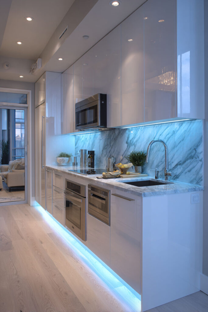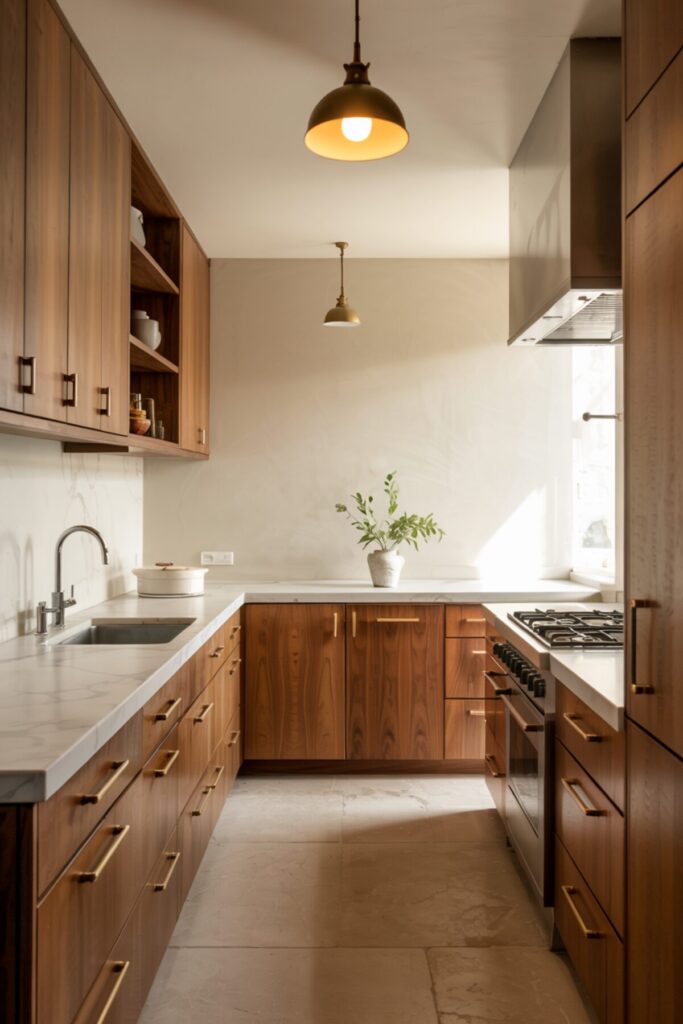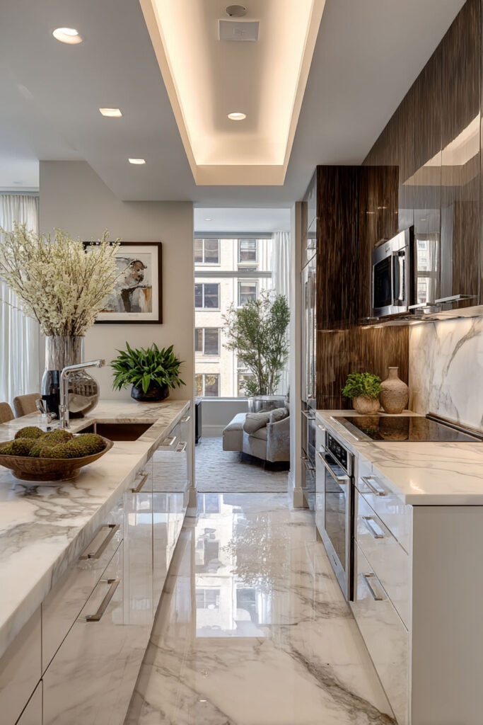 Elevate the humble galley kitchen layout through premium materials and clever design. Floor-to-ceiling cabinets on one side, windows or open shelving on the other to prevent tunnel feeling. Use mirror or high-gloss surfaces to bounce light and expand space visually.