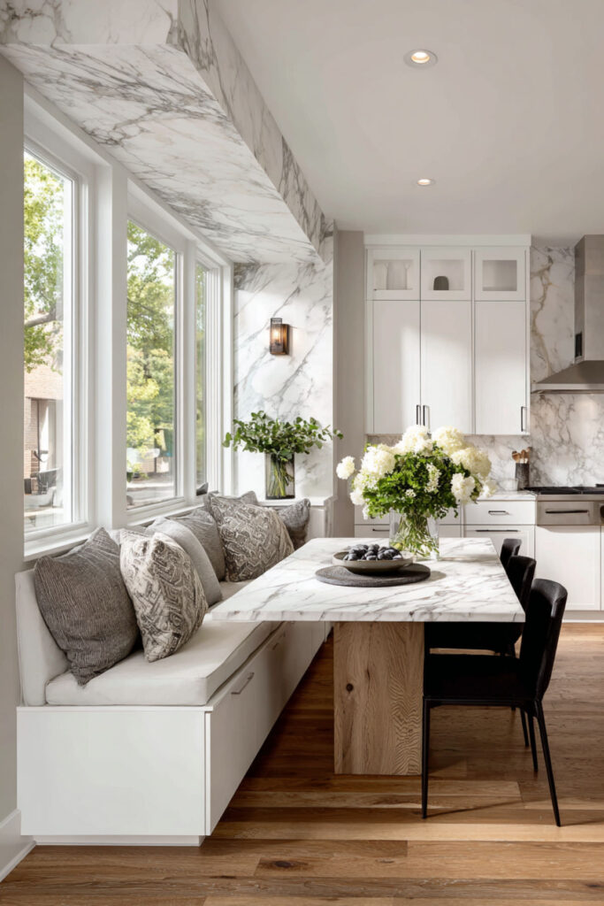 Replace traditional dining with built in seating featuring clean modern lines. Banquettes with minimal tufting or completely smooth upholstery. Tables that appear to float rather than rest heavily. The built-in nature allows for hidden storage while maintaining sleek appearance.