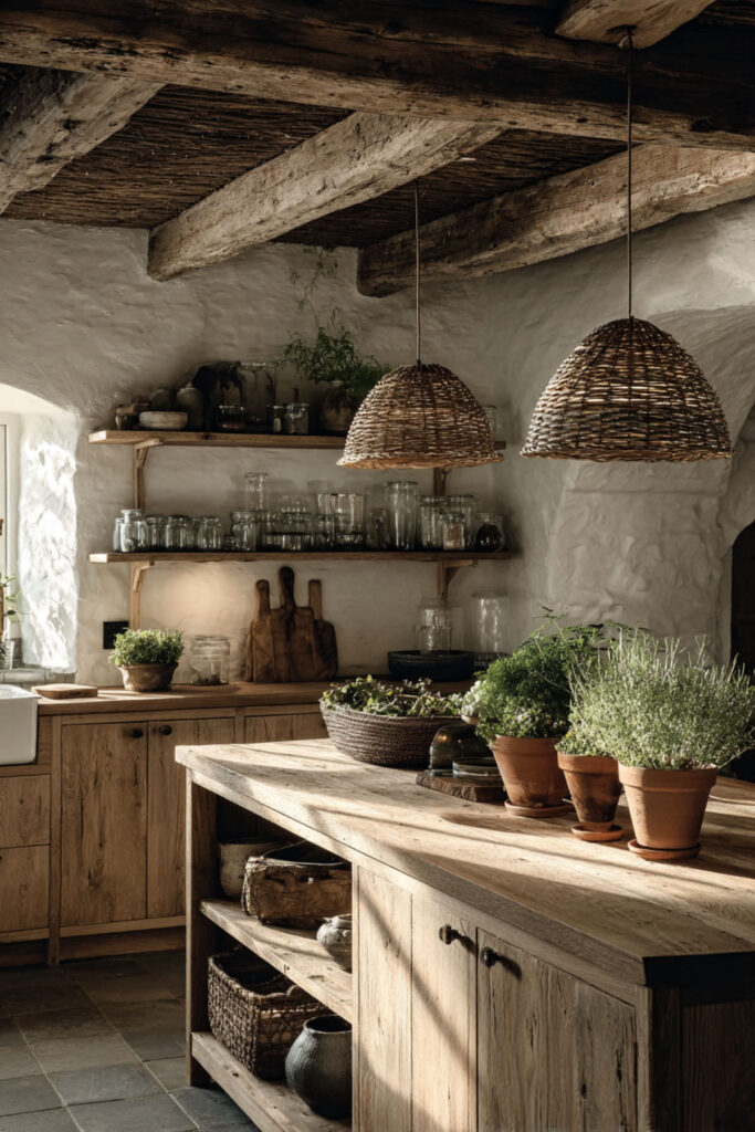 Nordic farmhouse combines rural elements with Scandinavian restraint—think painted wood, simple shelving, vintage finds, but all edited carefully. It’s a farmhouse without clutter, rustic without roughness. Natural materials dominate but refinement remains.