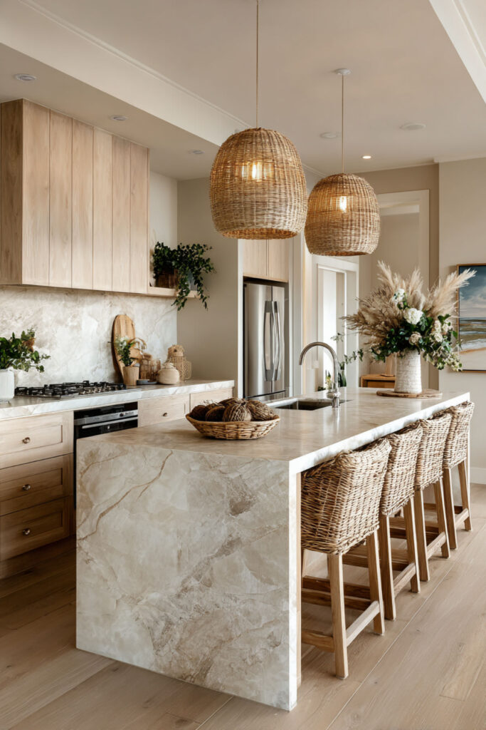 Japandi kitchens achieve ultimate serenity through the marriage of two minimalist traditions. I suggest finishing the space with this japandi chandelier to enhance warmth and subtle elegance.