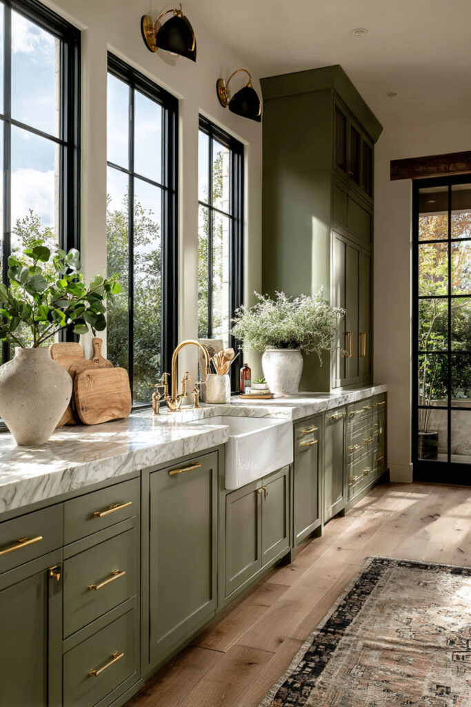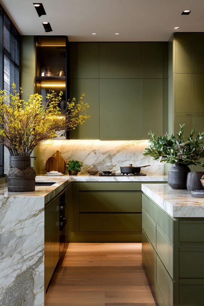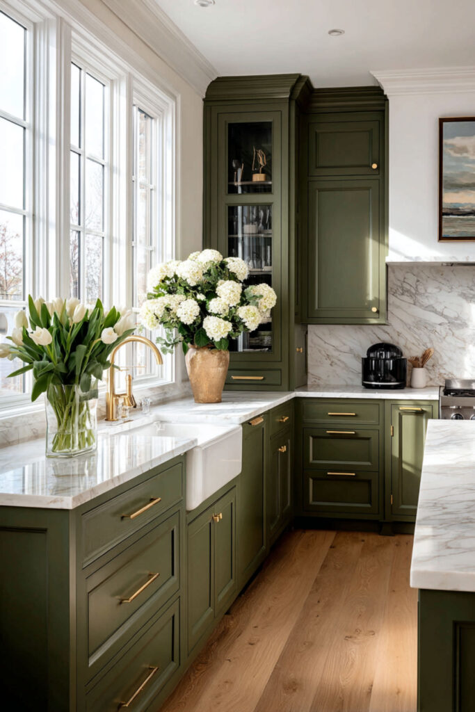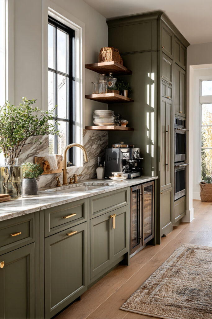 If standard olive feels too safe, going darker creates a kitchen with real presence. Dark olive green kitchen cabinets lean almost toward forest green in certain lights, bringing a richness and depth that feels sophisticated and a little bit dramatic. In kitchens with high ceilings, large windows, and warm wood floors, dark olive becomes truly stunning — it absorbs light in a way that makes the room feel cocooning rather than closed in. I came across this trending approach recently — designers using deeper olive tones on full runs of cabinetry for a drenched, enveloping effect. I recommend dark olive on all cabinets with a honed white marble countertop for contrast. Add brushed brass hardware and warm under-cabinet lighting to bring out the green’s depth. The under cabinet lighting is a game-changer — it makes the counters glow and reveals the olive’s warmth in the evenings.