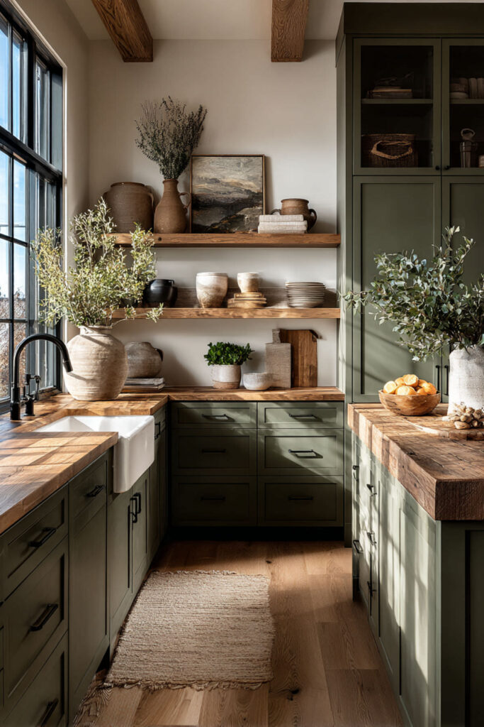Olive and wood is one of those combinations that feels like nature designed it herself. Olive green kitchen cabinets with butcher block countertops bring an earthy, organic warmth that makes the kitchen feel like a countryside retreat — sturdy, honest, and completely inviting. The honey tones in the wood soften the depth of the olive and add a brightness that keeps the room from feeling too dark. I recommend a thick-cut maple butcher block, at least an inch and a half. The grain adds texture and movement to the countertop that stone simply can’t replicate. Oil it regularly and it develops a gorgeous patina over time. This wood countertops with green cabinets pairing is perfect for anyone who wants their kitchen to feel warm, natural, and genuinely lived-in — not staged.