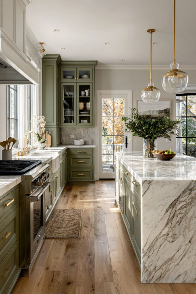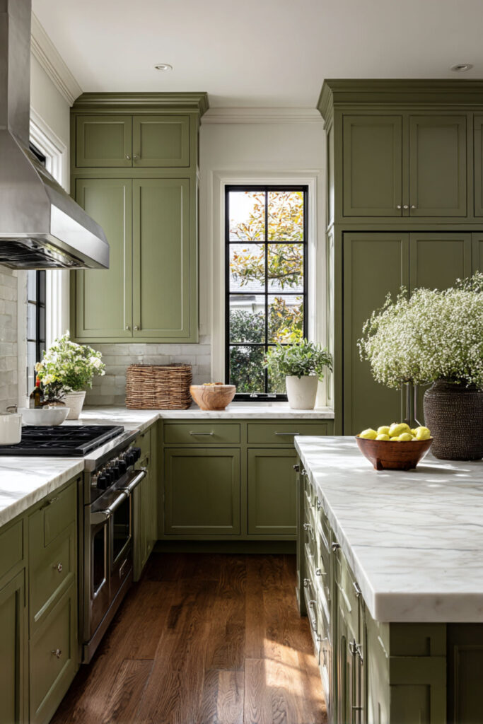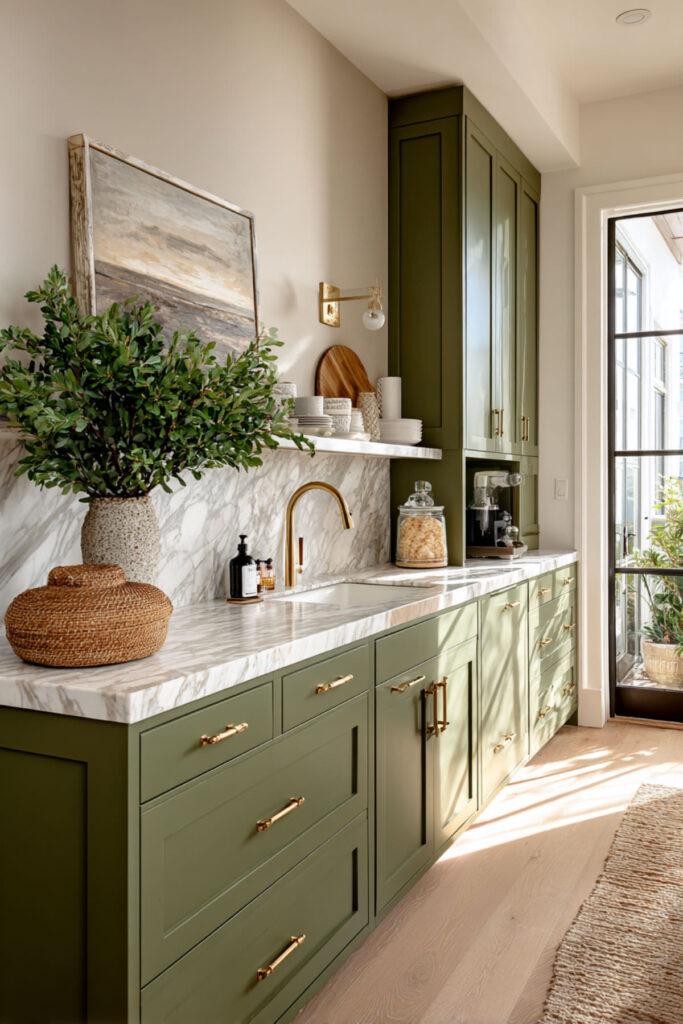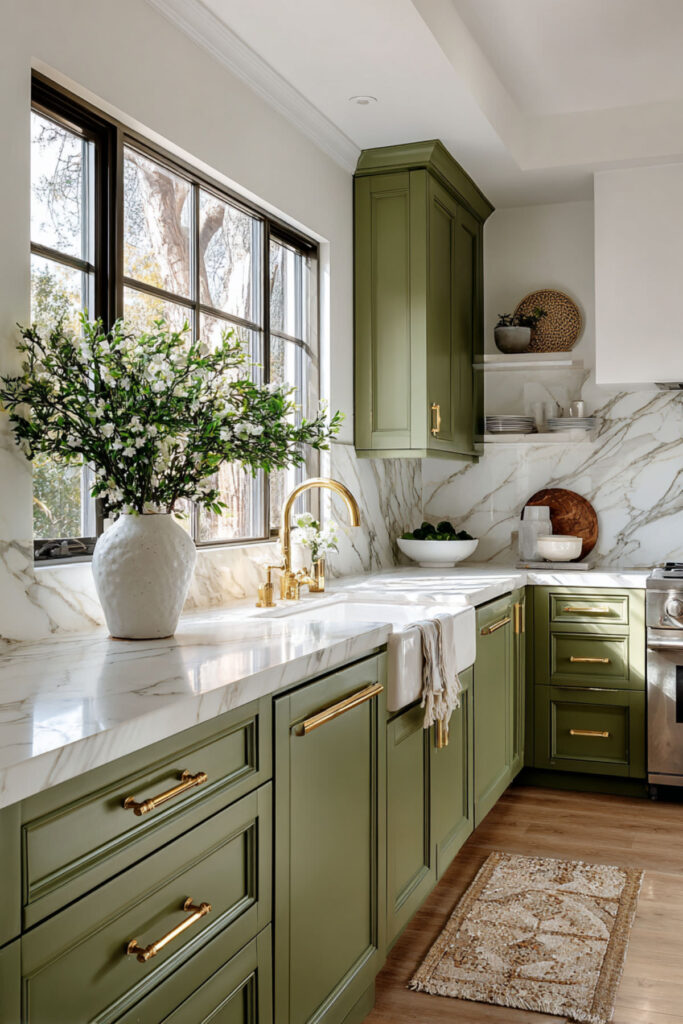 Olive green kitchen cabinets have moved from trend to staple faster than almost any other color in recent memory. Designers keep calling it the grown-up evolution of sage — richer, moodier, and endlessly adaptable. Whether you pair olive with white marble, black countertops, natural wood, or brass hardware, the color responds beautifully every time.