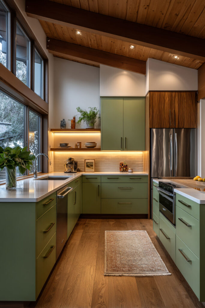Mid Century Kitchen Ideas With Olive Green Cabinets