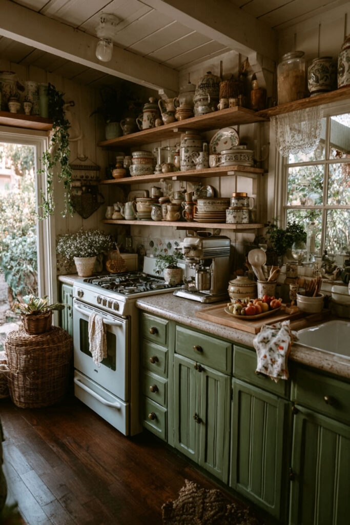 Cottage core and olive green are a warm, charming combination. An olive green kitchen cottage core setup leans into that collected, handmade quality — open shelving displaying stoneware and wooden boards, vintage hardware, a deep farmhouse sink, maybe a linen curtain under the counter instead of a cabinet door. The olive adds depth and richness that lighter greens sometimes lack, giving the cottage aesthetic more substance. I recommend natural oak open shelves above olive lower cabinets, styled with cream stoneware, a few glass jars, and a small potted herb. The combination of the warm wood, the rich olive, and the cream ceramics creates this layered, herbal kitchen quality that feels nurturing and beautiful at the same time.