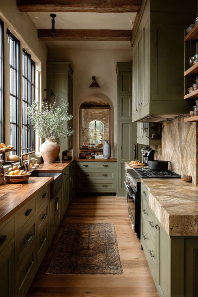Let’s close with the boldest move: a full olive green kitchen. Cabinets, island, walls — all in the same olive family, varying slightly in tone and finish. The drenched look creates this incredible sense of immersion where the color becomes architectural. It’s not a painted room; it’s a room shaped by color. Designers are calling this one of the most confident moves in 2026 kitchen design, and when it’s done in olive, the effect is warm, sophisticated, and endlessly interesting. I recommend varying the sheen — matte on the cabinets, satin on the walls, and perhaps a slightly lighter olive on the ceiling trim. The subtle variation keeps the room from feeling flat and gives your eye different textures to register. Add white marble counters and brass fixtures as the only contrast. Would you go fully drenched in olive? I think it’s one of the most stunning kitchen choices you can make — a commitment that pays off every single time you walk in the room.