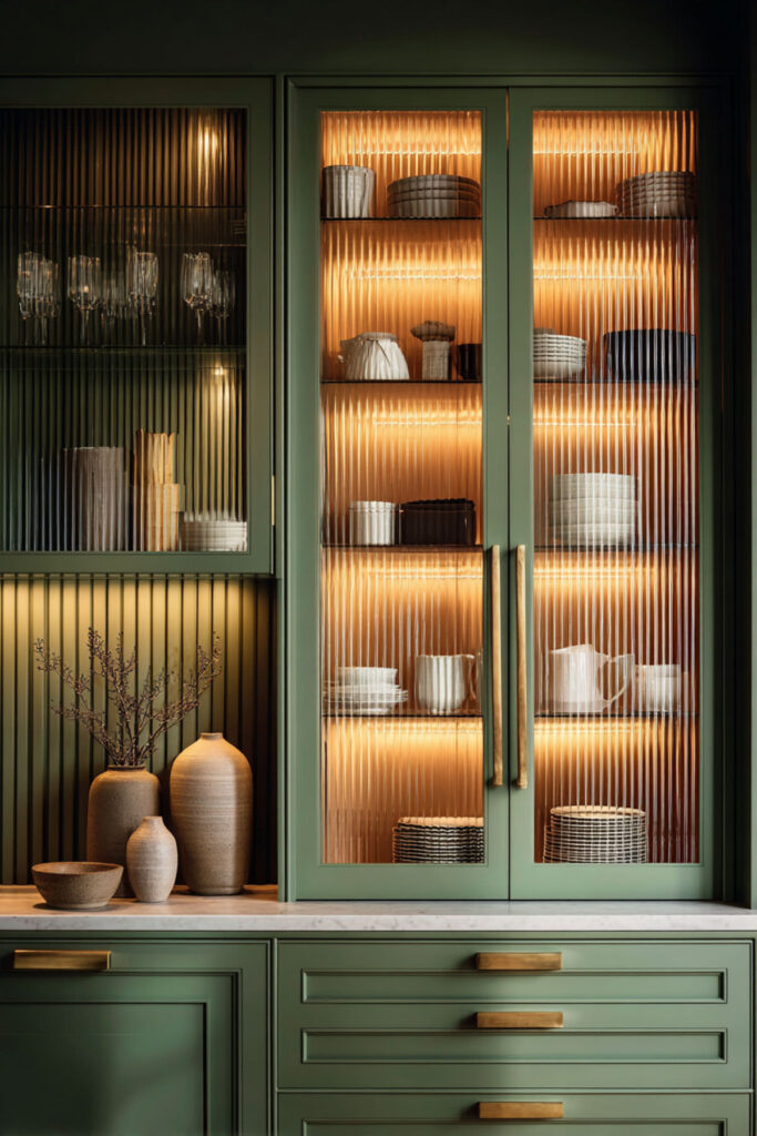 Here’s a detail that makes an outsized difference: under cabinet lighting beneath olive green uppers. Warm-toned LED strip lights (2700K to 3000K) illuminate the countertop below and cast a soft glow on the olive cabinets that brings out their golden-green undertones. Without this light, olive can sometimes read grey or flat in the evenings. With it, the color comes alive. I recommend LED strip lights in a warm tone, installed along the full length of the upper cabinets. Dimmable is best — bright for cooking, softer for evening atmosphere. It’s one of the most affordable upgrades with the biggest visual return, and it makes your olive kitchen look like it belongs in a design portfolio. Cabinet lighting is the kind of thoughtful detail that separates a nice kitchen from a truly beautiful one.