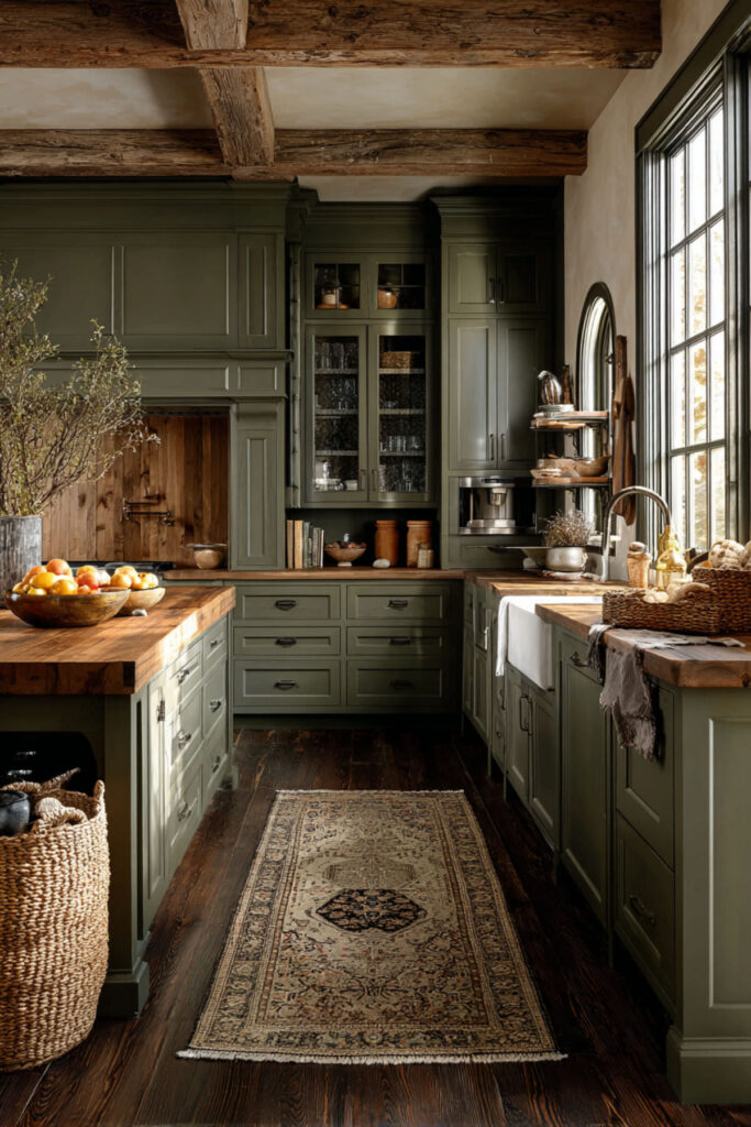 I really recommend this sophisticated olive paint that changes beautifully throughout the day. The color works with literally every metal finish—brass, black, chrome—giving you endless flexibility. Olive cabinets make everything else in your kitchen look intentional, from your grandmother’s copper pots to that modern marble backsplash you’ve been eyeing.