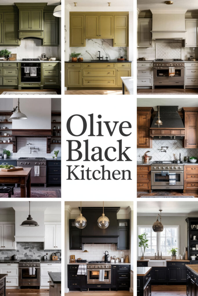 Black accents against olive creates sophisticated contrast that’s less harsh than black and white but equally striking. Think black fixtures, black window frames, or a black range against olive cabinetry. This combination feels very European—sophisticated but not trying too hard.