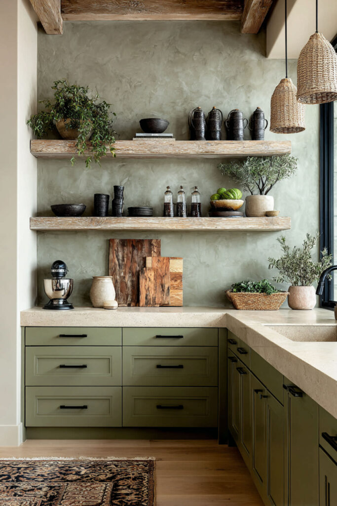 Once you’ve committed to olive, the styling possibilities are endless. Copper pots against olive walls, terracotta planters on olive shelves, white ceramics creating contrast—every choice enhances the natural sophistication.