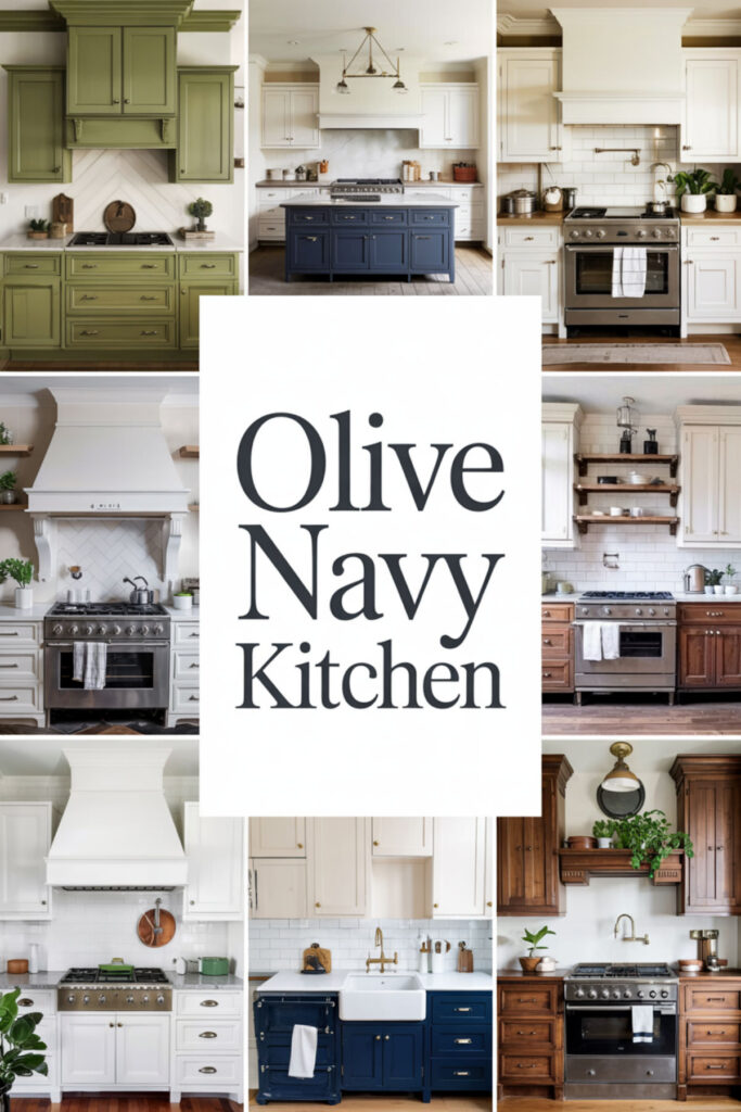 Navy and olive might seem like an unusual pairing, but together they create incredible depth and sophistication—like deep ocean meets forest. Use navy for an island or lower cabinets with olive uppers, or vice versa.
