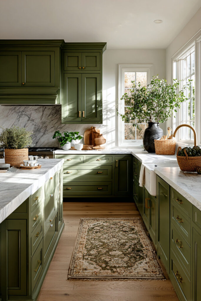 This is the foundation. Olive green kitchen cabinets paired with white marble countertops create a contrast that’s both dramatic and serene — the deep, warm green below, the cool, luminous marble above. The grey veining in the marble acts as a visual bridge between the two, pulling subtle grey tones from the olive and creating a palette that feels cohesive without being matchy. I recommend a matte olive shaker cabinet with a honed Calacatta marble countertop. The matte finish on the cabinets keeps the green from reading as glossy or dated, and the honed marble has a soft, tactile quality that invites you to actually use the surface. Brushed brass hardware ties the warmth together. This olive green kitchen cabinets combination is where meal prep becomes something you look forward to — because the room itself feels like a reward.