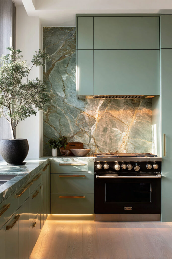 Green Kitchen Marble Backsplash: Slab Behind the Range