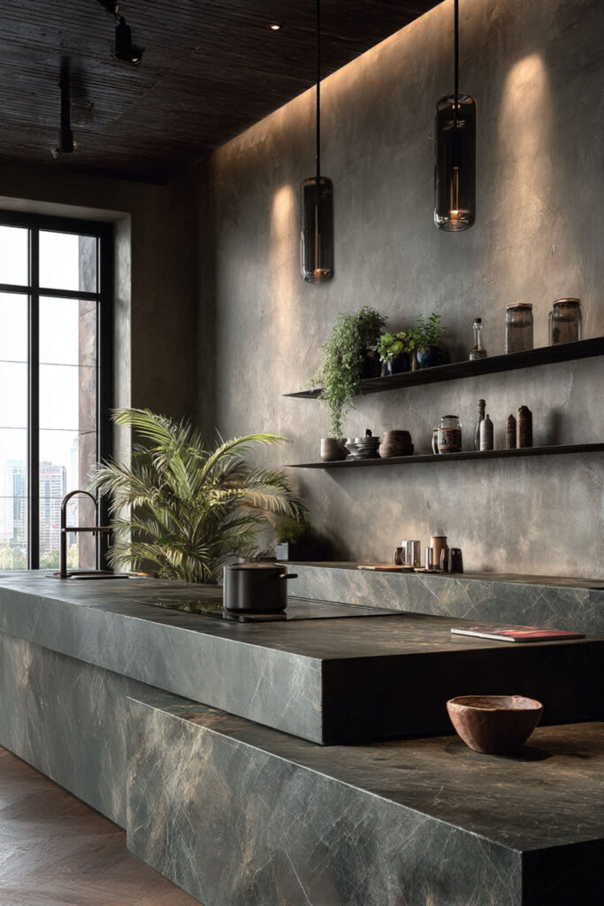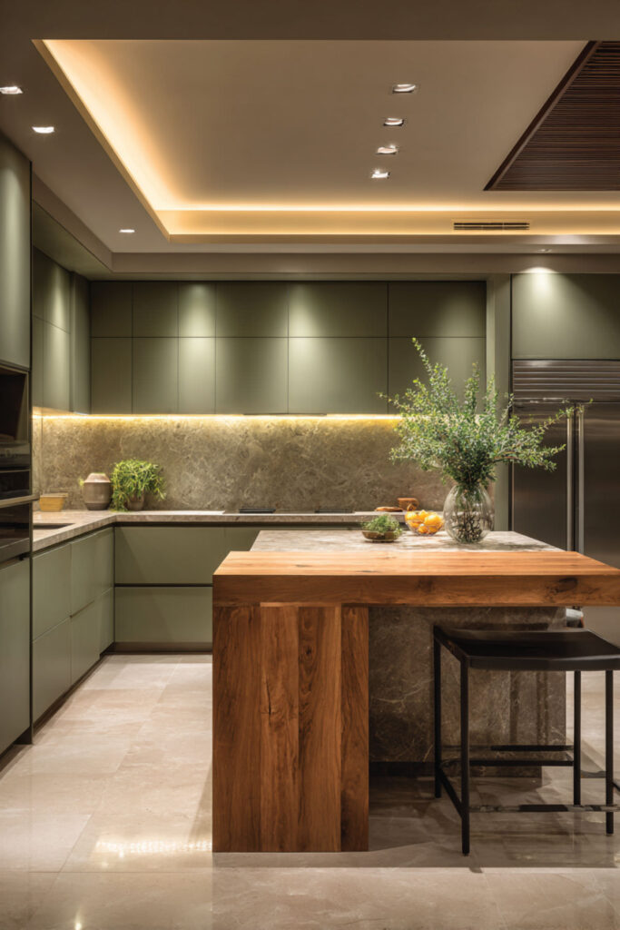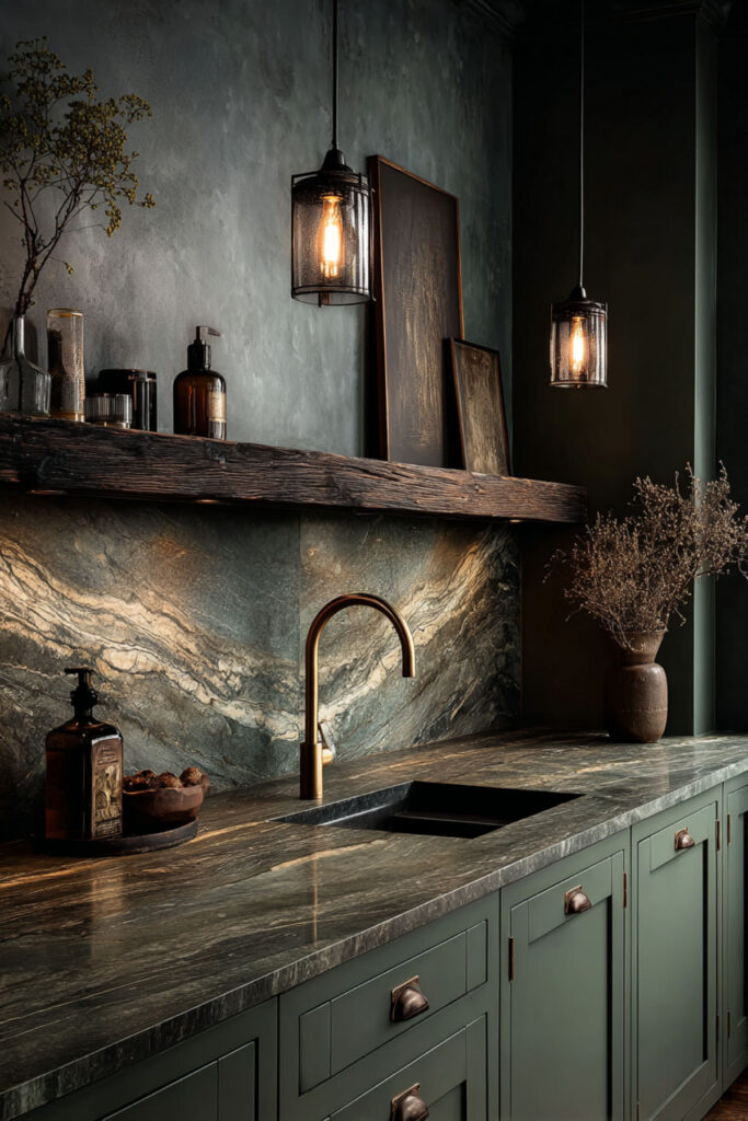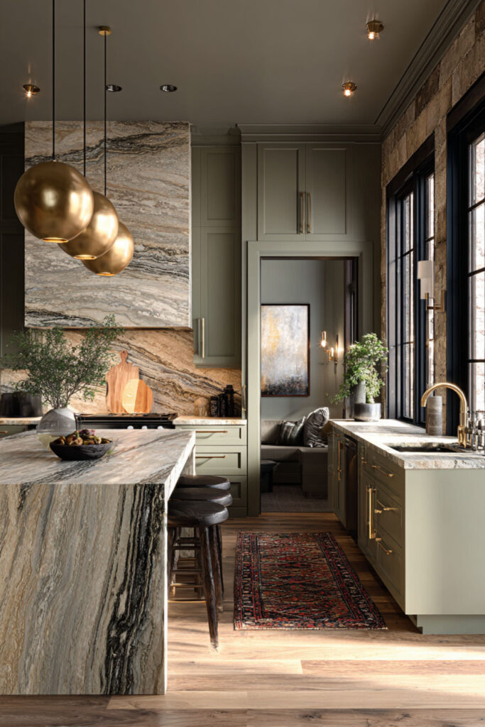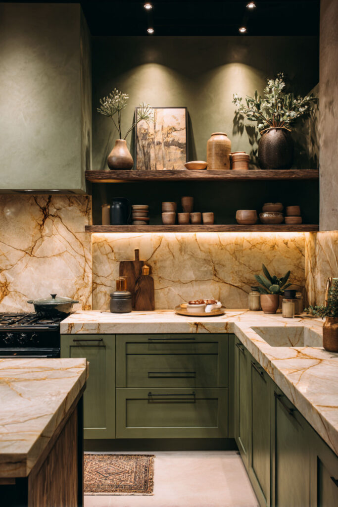 Dark Olive Kitchen With Honed Marble for Understated Luxury