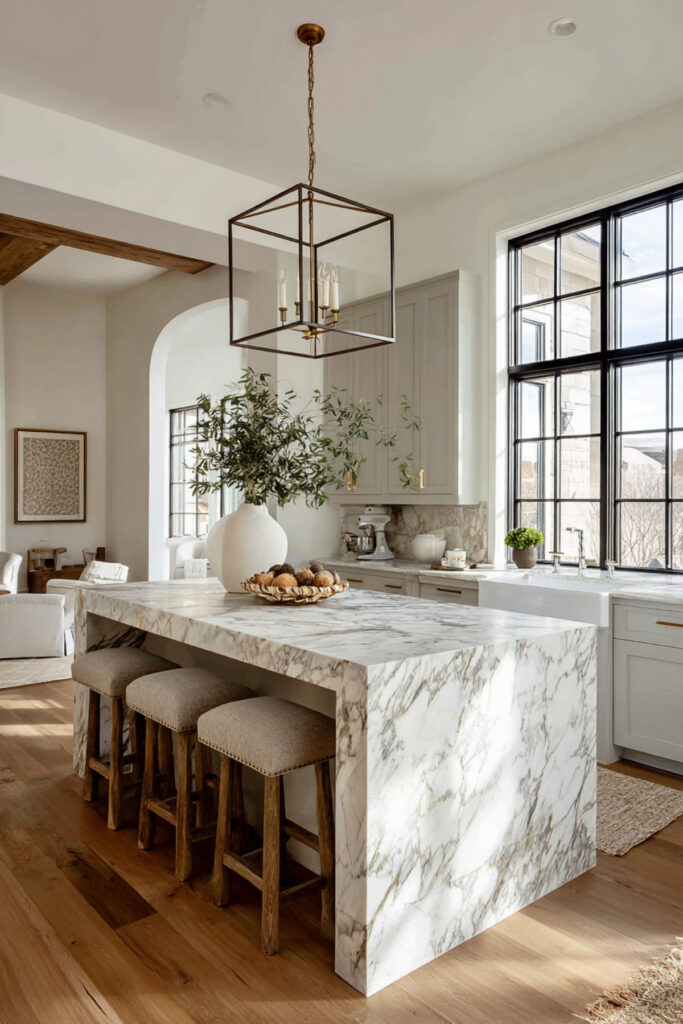 If full olive cabinets feel too bold, an olive island with a marble top surrounded by cream or white perimeter cabinets gives you the combination in one controlled, stunning focal point. The island becomes the room’s anchor — where prep happens, where family gathers, where the olive and marble story lives. The cream surroundings keep the room bright and open. I recommend an olive shaker island with a thick waterfall marble edge on one side. The waterfall detail — where the marble wraps down the island’s side — creates a visual weight that makes the island feel like a piece of furniture rather than just cabinetry. It reminds me of those beautiful kitchens in renovated brownstones along Commonwealth Avenue in Boston — where the island is the room’s personality.