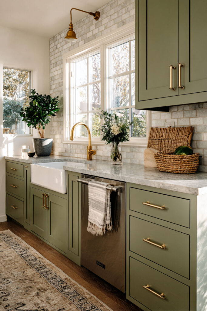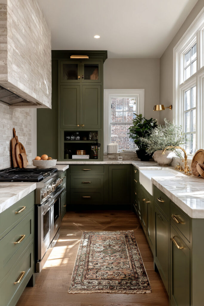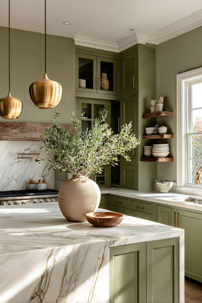Olive, marble, and brass together create a trifecta that feels opulent without being excessive. The olive brings earthy warmth, the marble brings cool elegance, and the brass brings a golden glow that ties the warm and cool elements together. It’s a palette that looks like it was designed by someone who understands the interplay of temperature in color. I recommend unlacquered brass cup pulls, a brass pot filler above the range, and brass pendant lights over the island. The brass develops a patina over time that deepens its character — the same way olive green and marble both age beautifully. These three materials were made to live together, and the kitchen they create feels simultaneously modern and timeless.