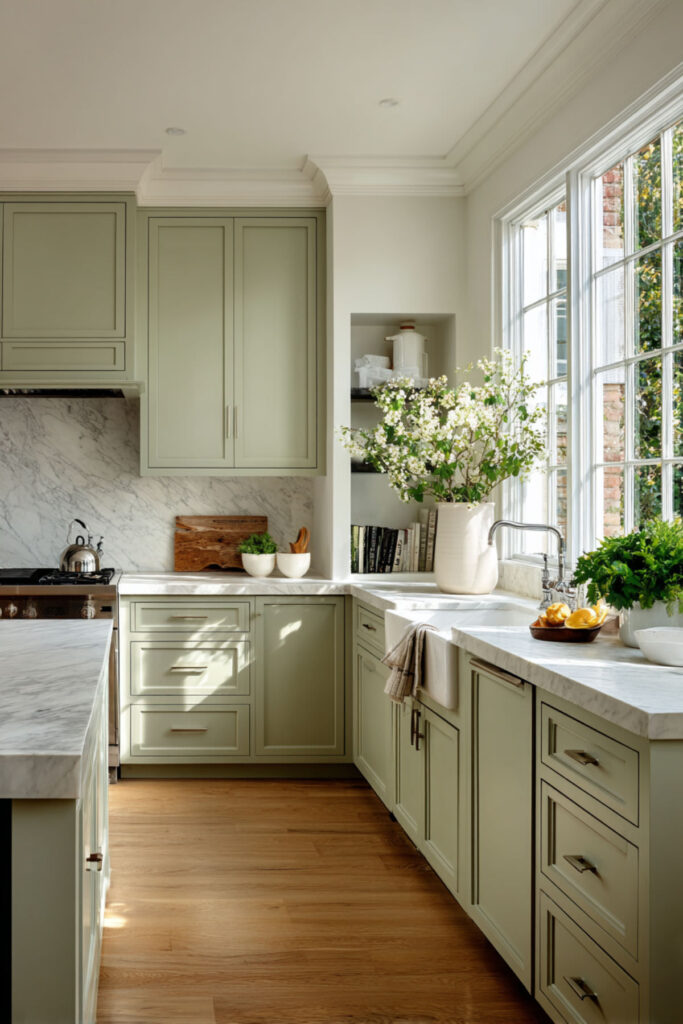 Light Olive Green Kitchen Cabinets With Soft Grey Marble