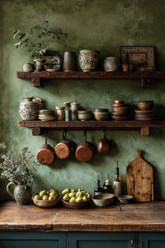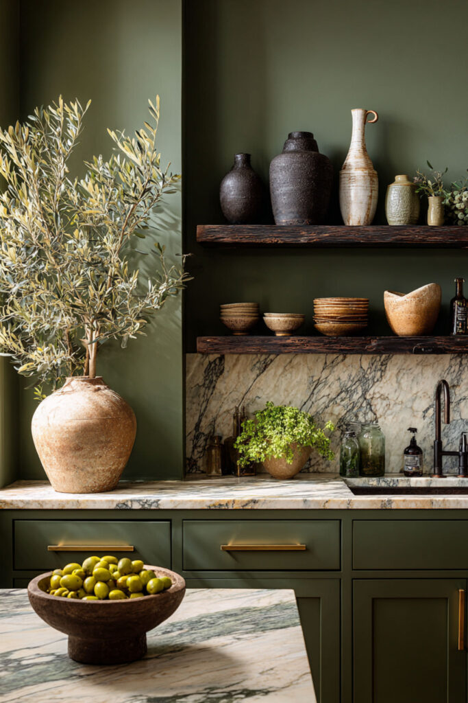 Moody Olive Kitchen Walls With Marble Open Shelving