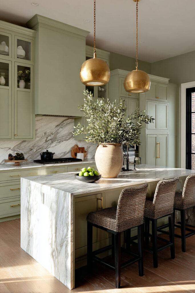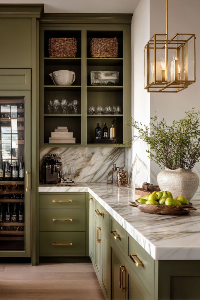 Olive Cabinets With Marble and Brass for Three-Way Warmth