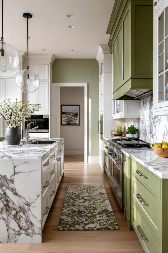 Olive Green Kitchen Cabinets With White Marble Countertops