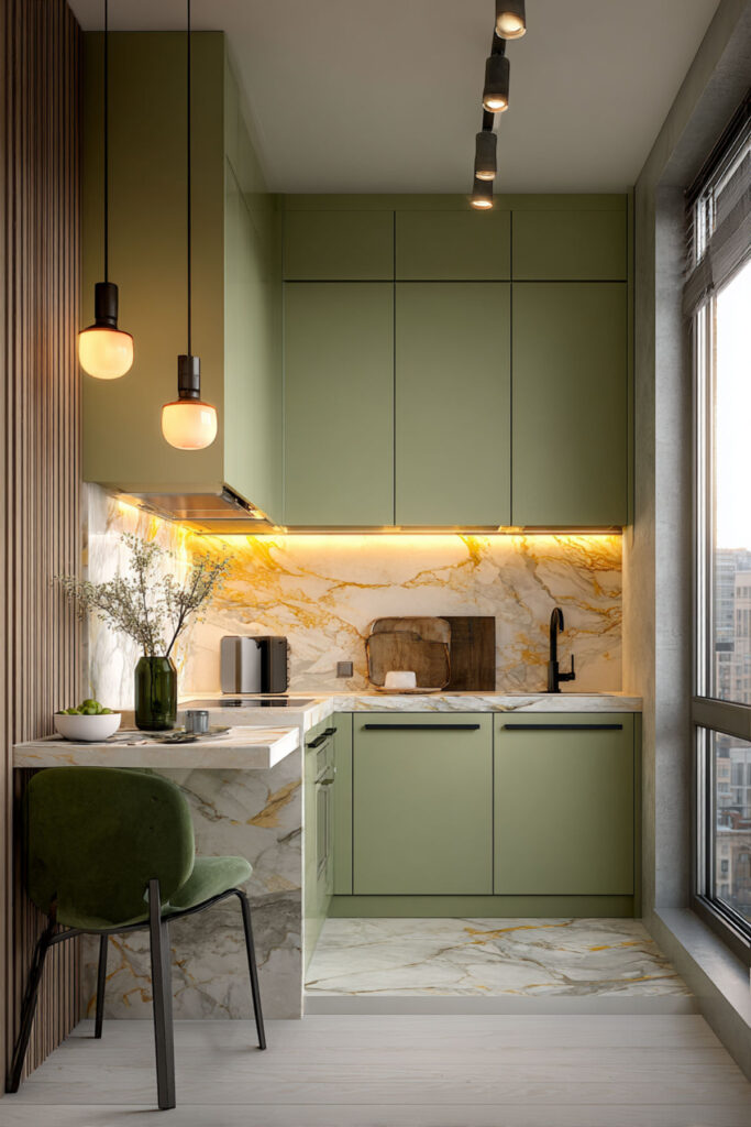 Olive Green Kitchen Ideas for Small Spaces With Marble Accents