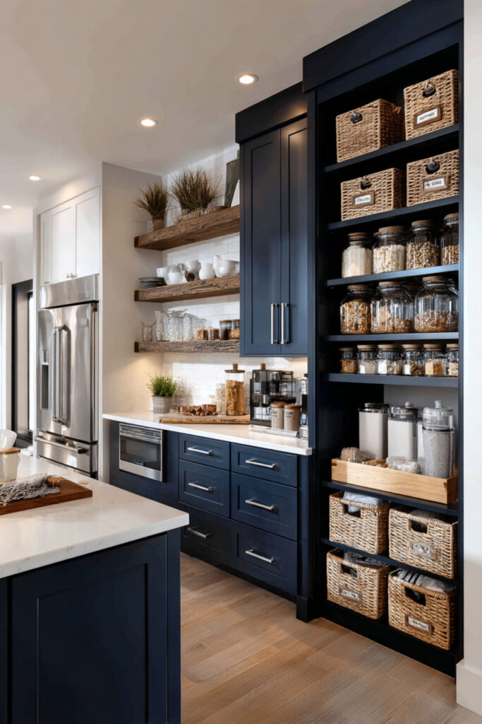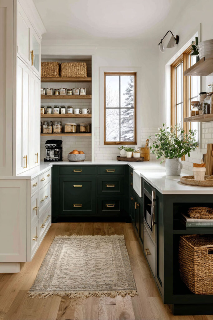 Navy blue kitchen cabinets on the island might designate homework supply central while sage green kitchen cabinets hold healthy snacks. This visual system works even when family members are too rushed to read labels carefully. The two-tone approach adds style while serving serious organizational purposes throughout hectic days. Different colors can designate different meal zones – breakfast supplies in one color, dinner prep in another. The aesthetic appeal means your organizational system enhances rather than detracts from kitchen design.