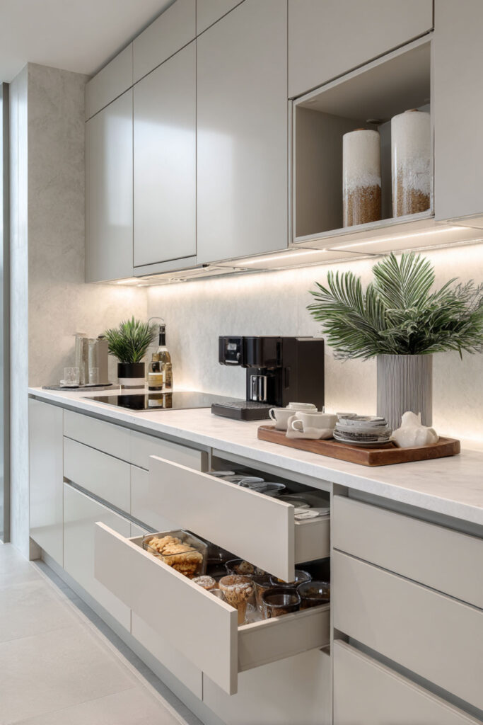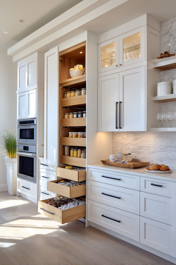 Corner kitchen cabinet with pull-out drawers or corner drawers maximize awkward spaces for storing bulky items that busy families accumulate. These corner solutions eliminate dead space where items disappear, never to be found until summer deep cleaning. Corner drawers work perfectly for storing large quantities of sports drinks, bulk snacks, or specialty items for different kids’ activities. The accessibility of corner storage means these spaces actually get used rather than becoming graveyards for forgotten items.