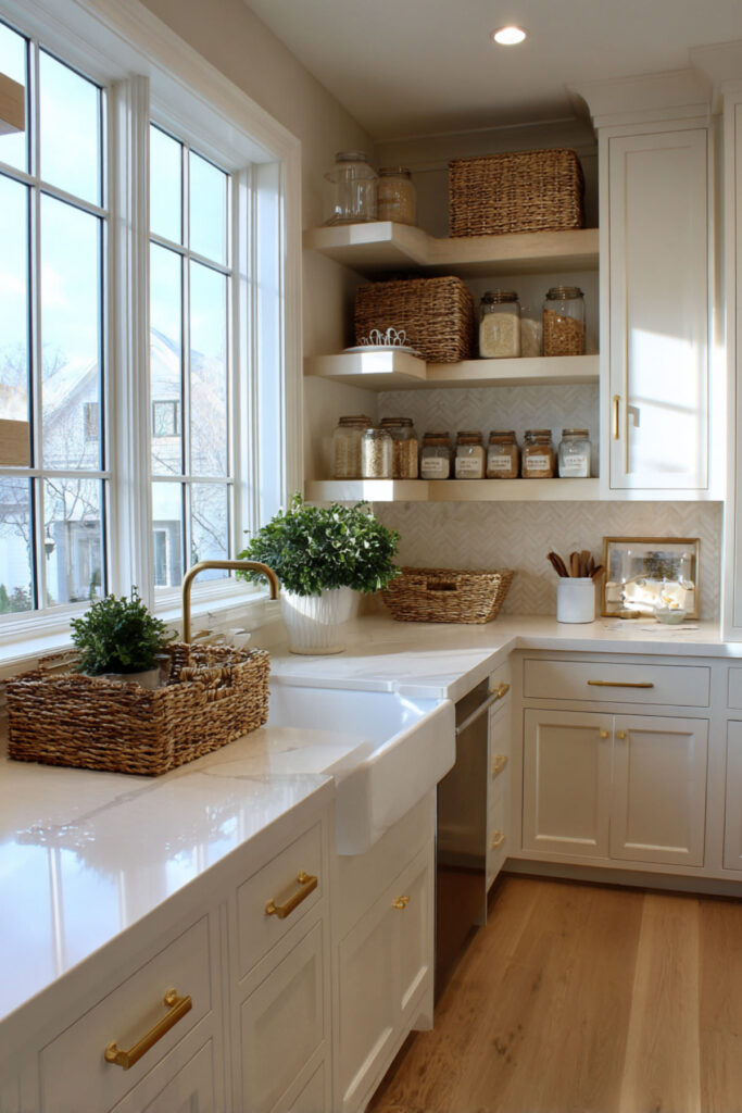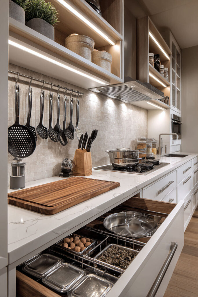 In a small kitchen organization system, labels aren’t cute – they’re survival. But make them aesthetic: use a modern label maker with clean fonts, not handwritten tape. Label inside cabinets so kids know where things actually belong. Create zones: breakfast cabinet, lunch drawer, snack basket, dinner prep area.