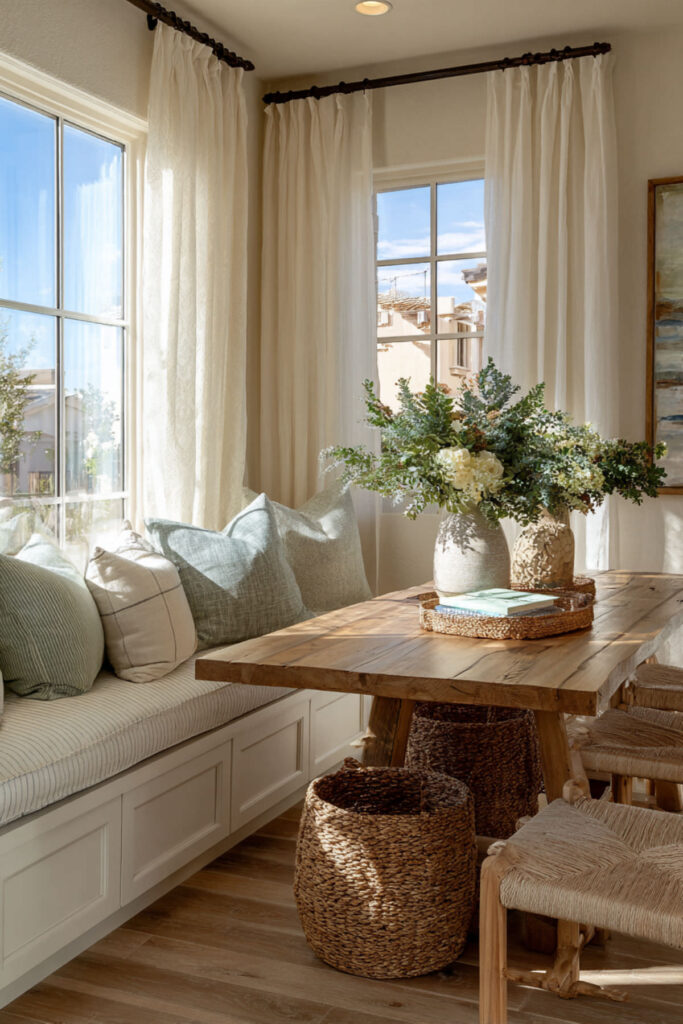 That cozy breakfast nook becomes more than eating space – it’s where family logistics happen. Install a bulletin board or chalkboard wall for family notes, schedules, and meal planning. Keep a basket underneath with school forms, writing supplies, and the family calendar.