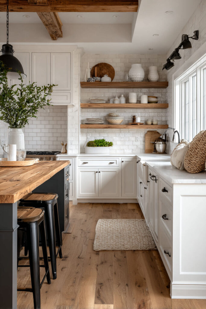 Use the farmhouse aesthetic to disguise modern necessities – router hidden in a “grain sack” cover, smart speaker in a wooden housing. This approach keeps technology accessible but not dominant. The style says “cozy family kitchen,” not “electronics store.”