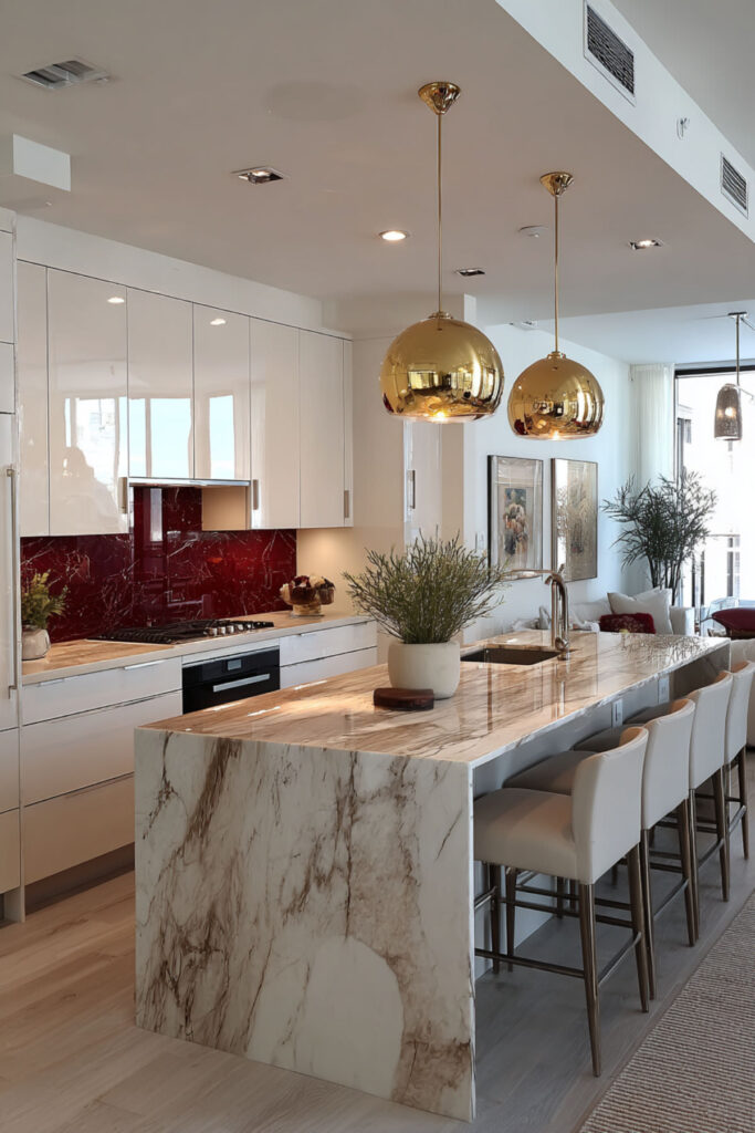 A red backsplash brings color to eye level while being supremely practical—tile and glass wipe clean easily, essential for flying food situations. Choose larger tiles with minimal grout for easier cleaning. The backsplash becomes your energizing focal point.