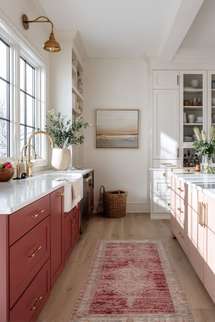 Whether you start with red dish towels or paint everything cherry, let red transform your kitchen from battlefield to energizing family hub. Check out these soft pink aesthetic kitchen ideas made for new moms who are craving gentle calm in their daily space.