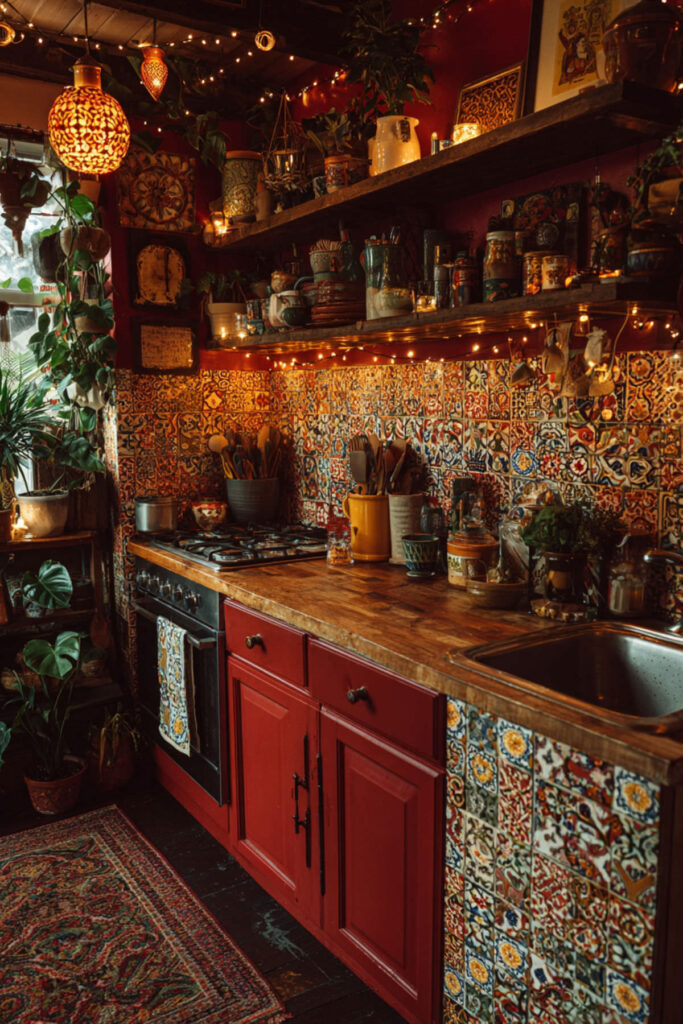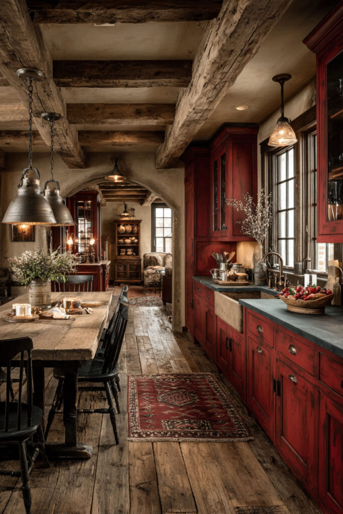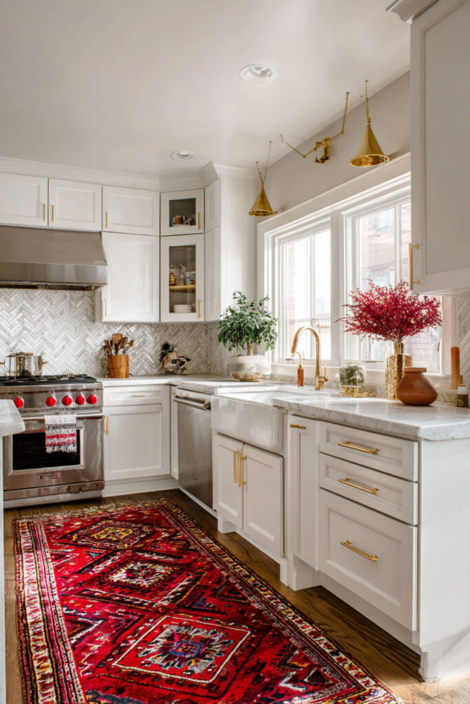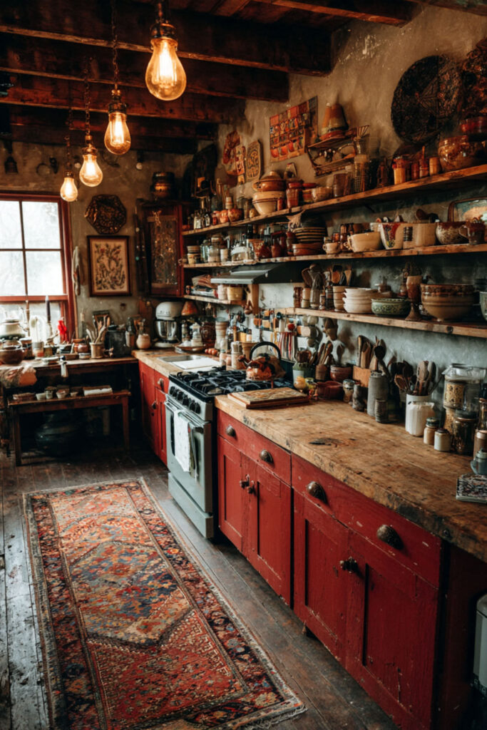 I really recommend machine-washable red rugs for comfort and practicality. Boho red kitchens feel like creative playgrounds for the whole family.