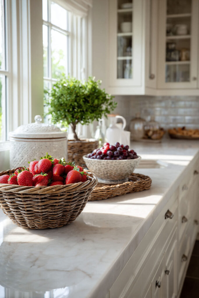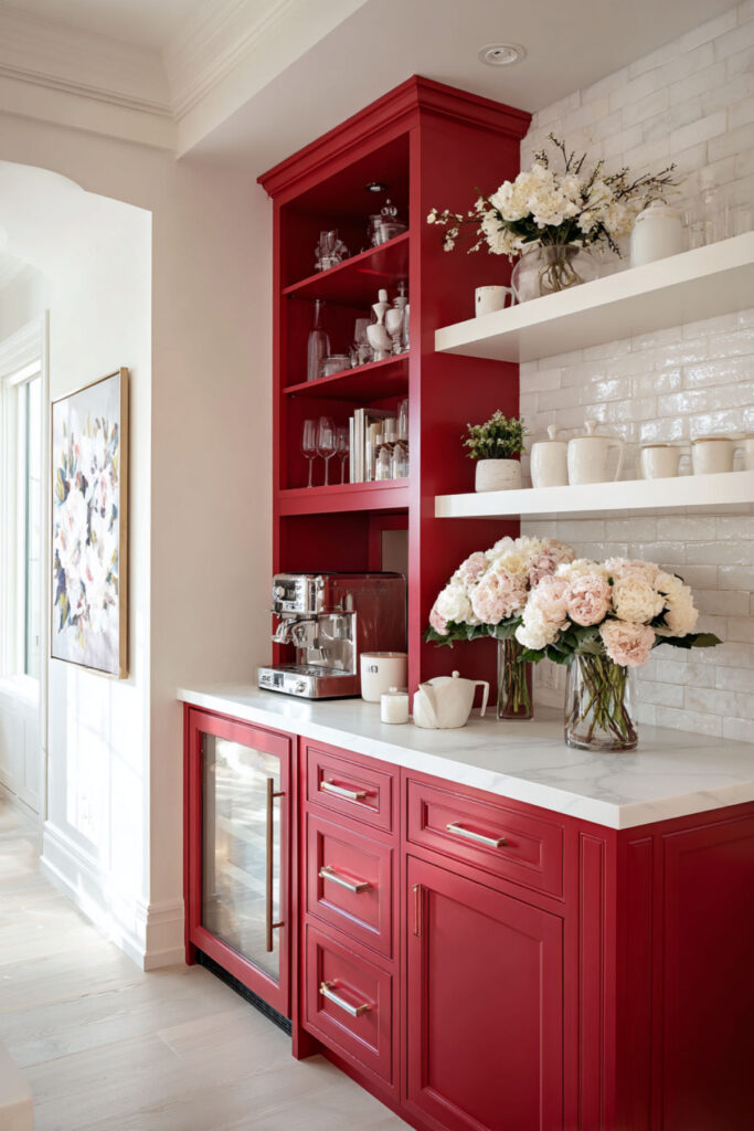 Keep counters styled with red accents that work—red canisters for snacks, a red fruit bowl always full, red kitchen tools in a red crock. These items are both decorative and functional. Choose unbreakable materials when possible.