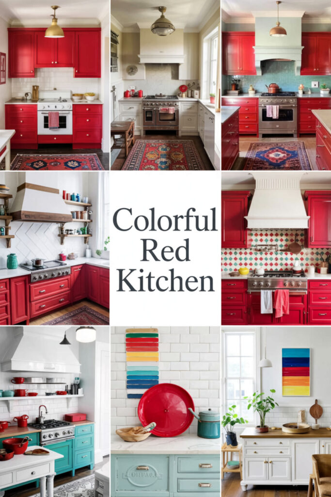 I really recommend testing color combinations with removable decals first. Colorful kitchens with red accents feel like creativity labs.