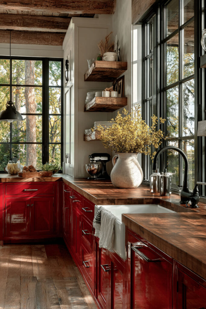 The combination feels organic and lived-in rather than staged. This approach works especially well in older homes where red needs to respect existing architecture. I strongly recommend these natural wood cutting boards displayed as functional art.