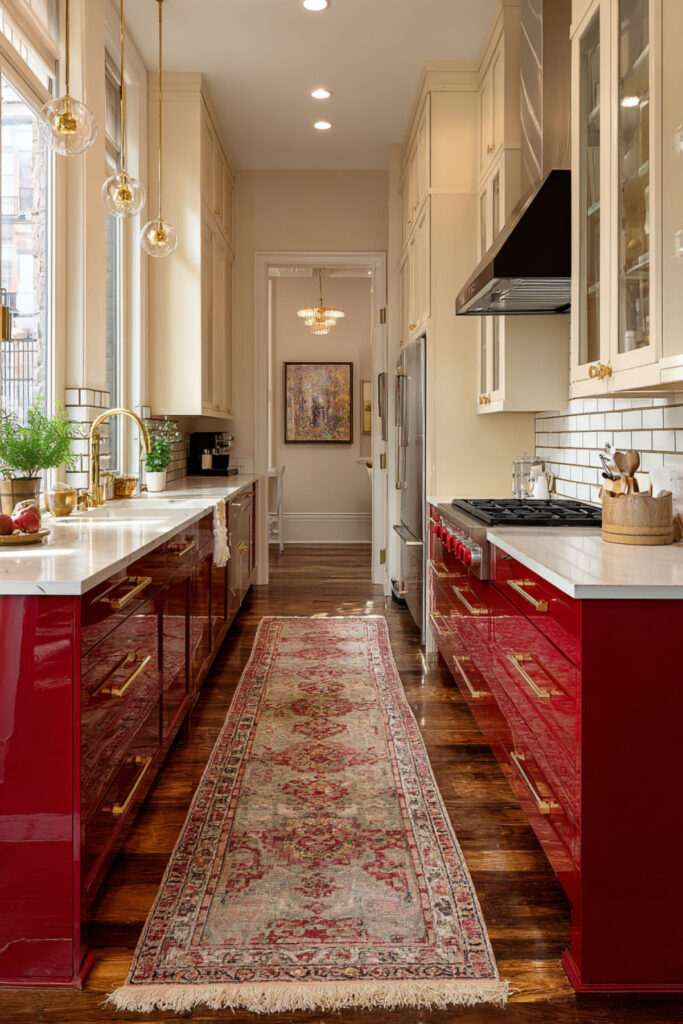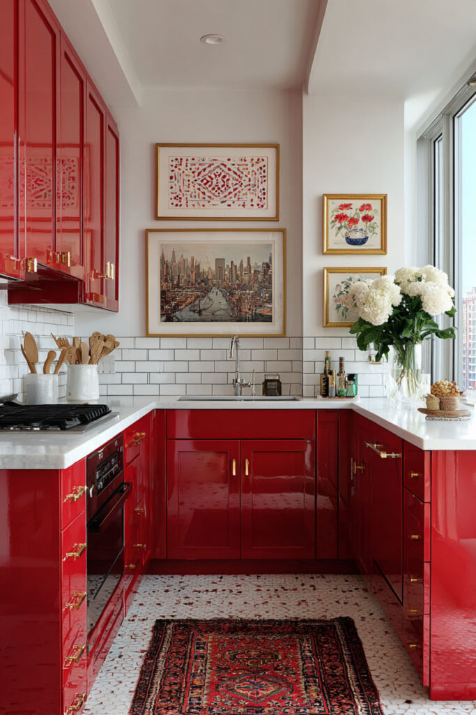Small kitchens can absolutely handle red – it’s about strategic placement. A single red wall, red lower cabinets only, or even just a red ceiling (yes, really) can transform tiny spaces. The key is maintaining breathing room with plenty of white or light surfaces.