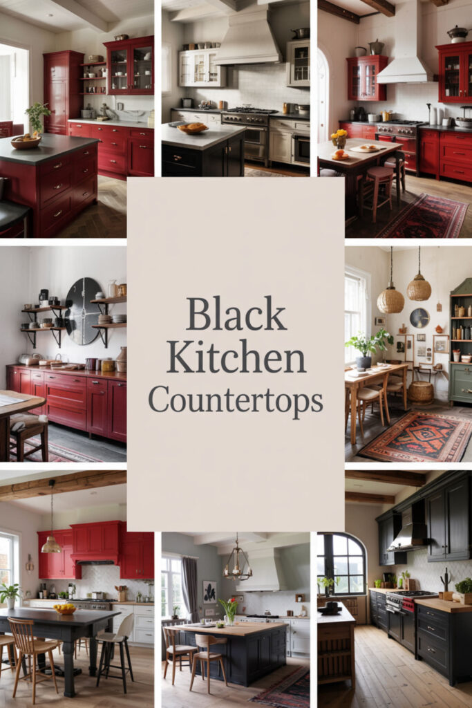 Black countertops against red cabinets create the ultimate power couple – think red nails against a little black dress. The black grounds all that energy, preventing the red from floating. Choose absolute black granite or quartz for maximum drama, or black with subtle sparkle for complexity. This combination works in both modern and traditional settings. The contrast actually makes both colors appear more intense.