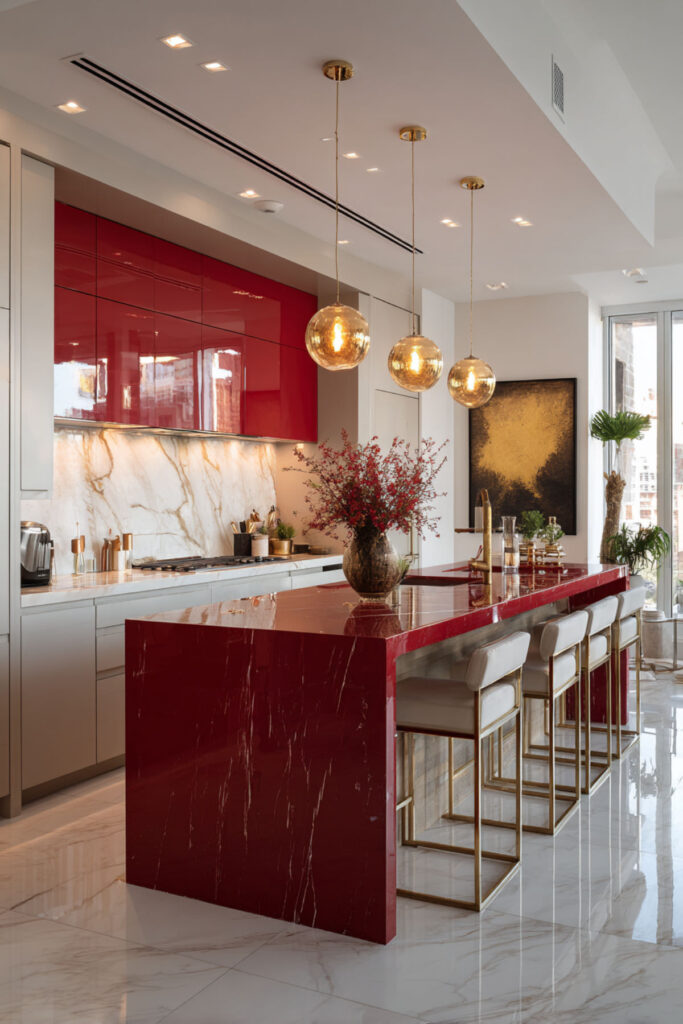 High-gloss red cabinets capture that fresh-manicure perfection. The shine amplifies the color while reflecting light, preventing the red from feeling heavy. Lacquered finishes work best, creating that liquid-looking surface. Handle-free designs emphasize the sleekness, while metallic hardware adds glamour.