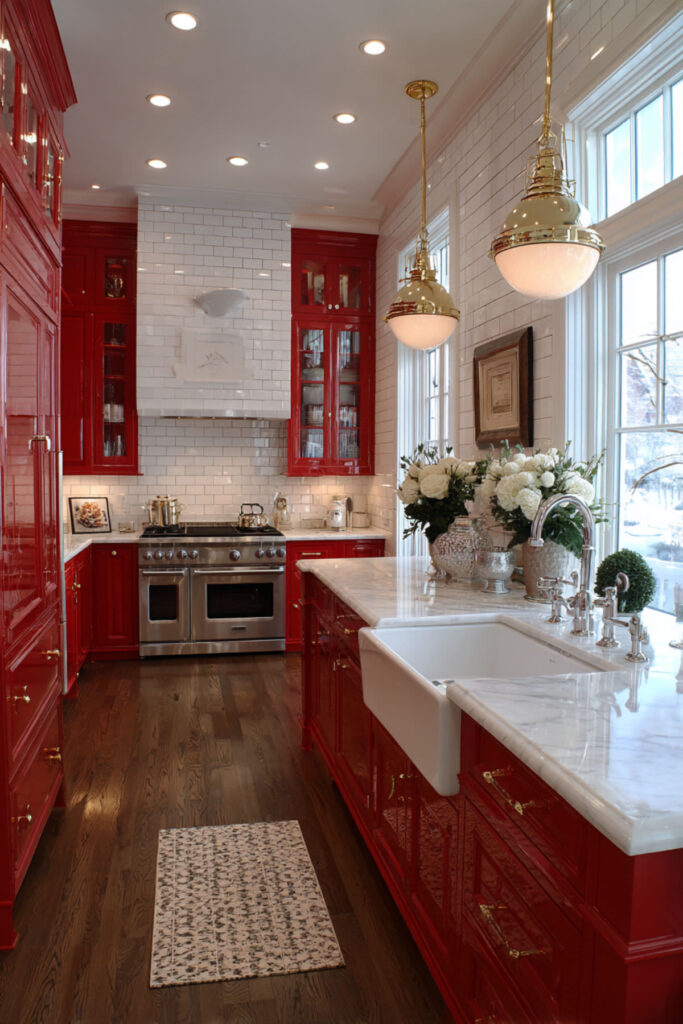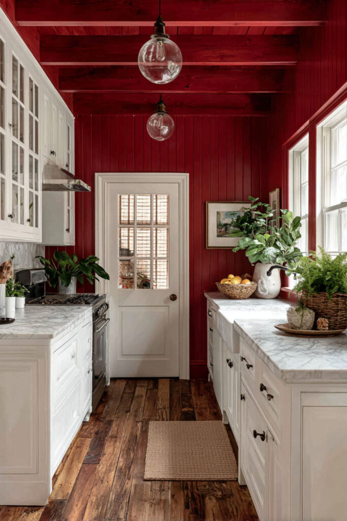 I really recommend this warm tomato red that glows in natural light. This approach brings a major color impact without touching your cabinets—perfect for renters or commitment-phobes. The red walls make white cabinets feel intentional rather than basic, and adding red pendant lights above ties the whole scheme together with a polished, coordinated touch.