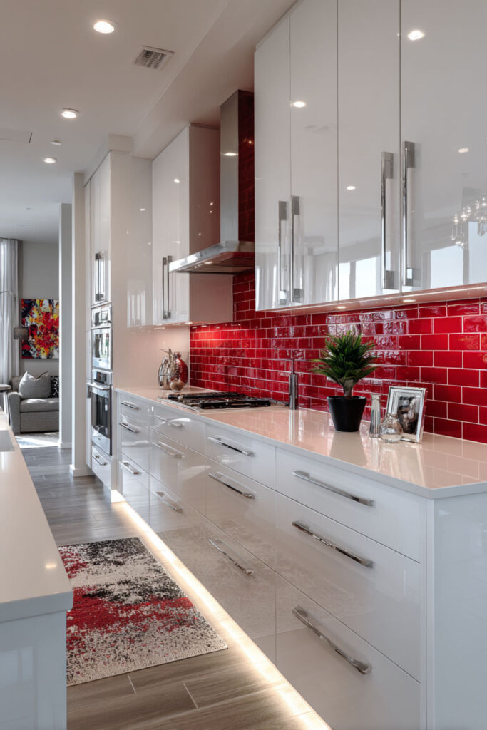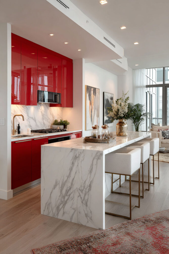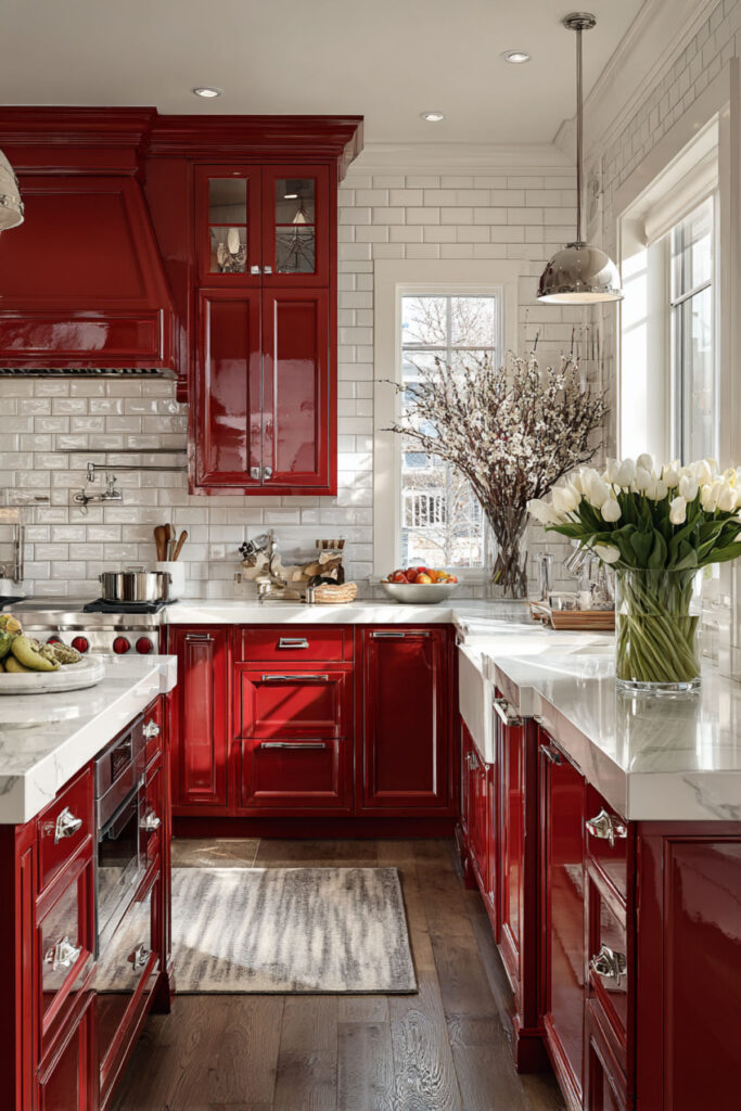 Red in modern kitchens proves that contemporary doesn’t mean colorless. Think high-gloss red cabinets with invisible handles, red glass backsplashes, or sleek red bar seating. The clean lines prevent red from feeling overwhelming or old-fashioned.