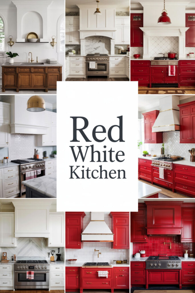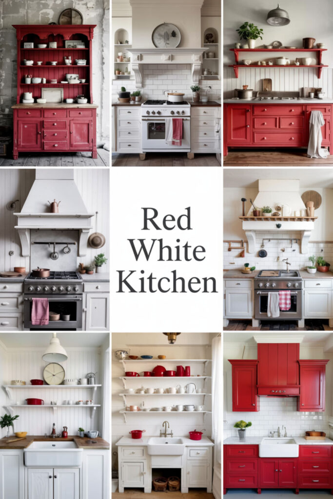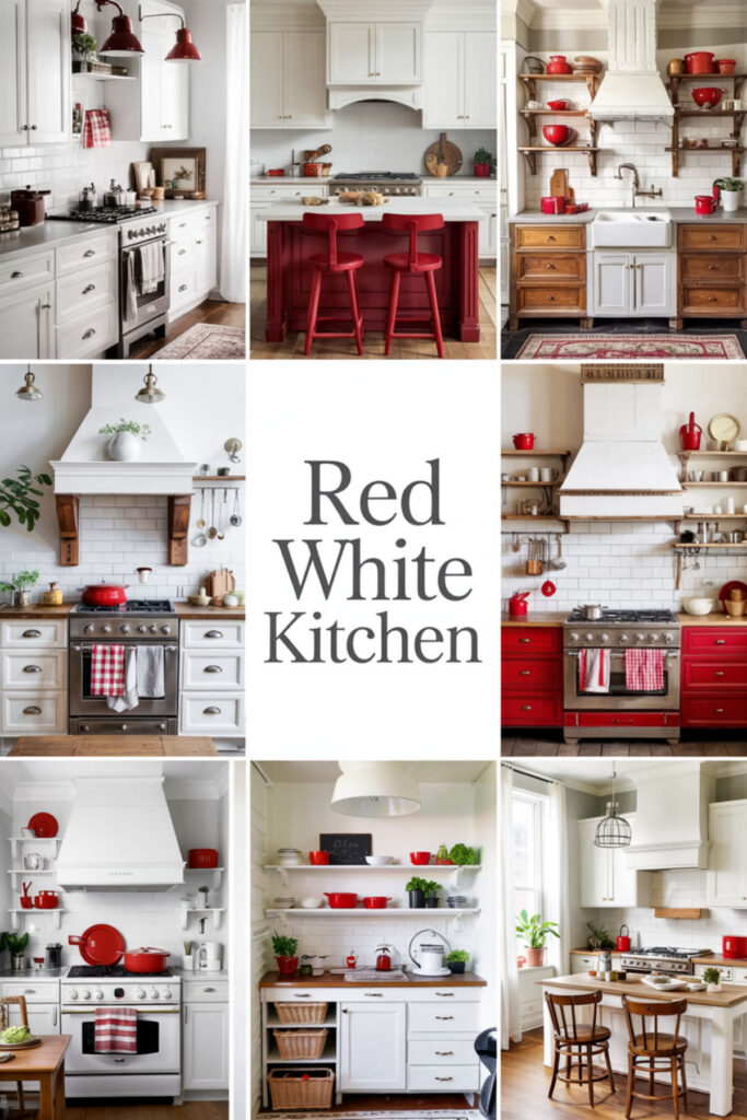 Layer red and white throughout your kitchen decor—red cookware displayed on white shelves, white dishes in red cabinets, red and white textiles. This repetition creates cohesion without overwhelming. Mix patterns and solids for interest.
